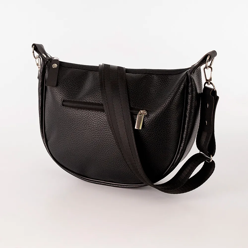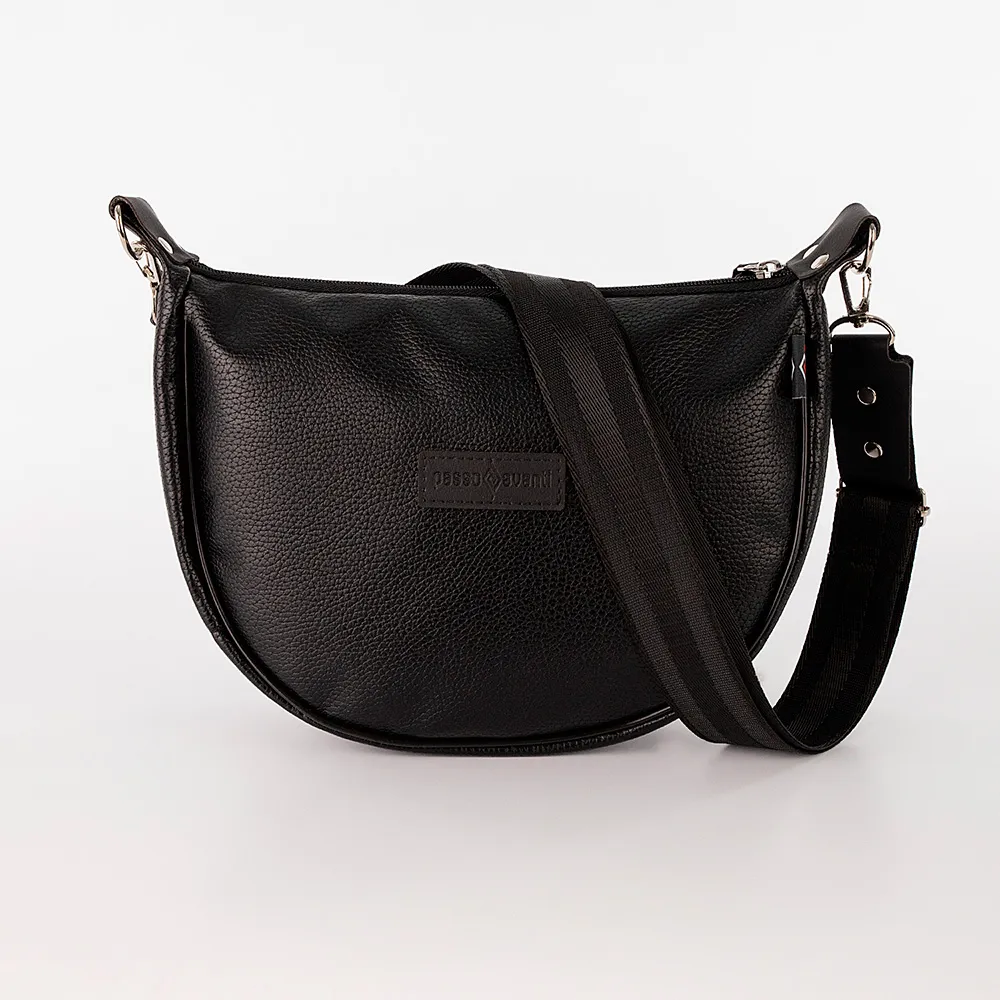 Сумка от торговой марки Passo Avanti из искусственной кожи черного цвета. Модель-седло в форме полукруга со съемным регулируемым плечевым ремнем, выполненным из текстильного материала. Отделение на молнии. Внутри: текстильная подкладка, карман на молнии, накладной карман.