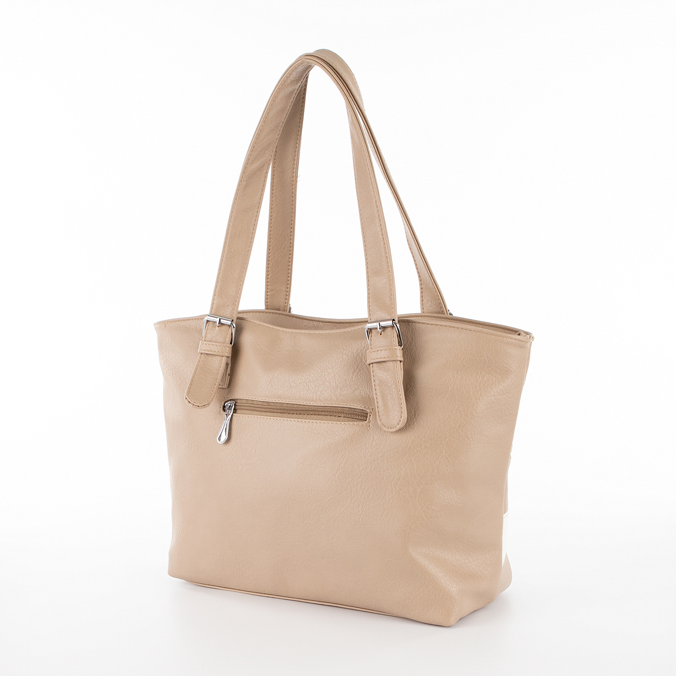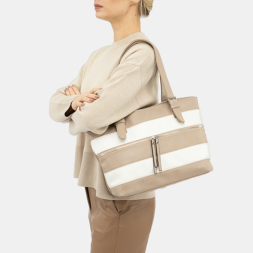 Повседневная сумка от торговой марки Passo Avanti из искусственной кожи с полосками белого и кофейного цвета. Модель с двумя удлиненными ручками. Отделение на молнии, с текстильной подкладкой. Внутри: средник и карман на молнии, накладной карман. На задней стороне – карман на молнии, на передней – карман на молнии с двумя бегунками, декорированными кожаными пуллерами.