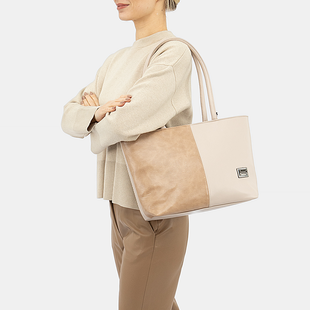 Сумка от торговой марки Passo Avanti из искусственной кожи в сочетании бежевого и кофейного цвета. Лицевая сторона декорирована вставкой с тиснением под рептилию. Модель с двумя удлиненными ручками. Два отделения на молнии с текстильной подкладкой. В одном из них – карман на молнии, в другом – накладной карман. На задней стороне – карман на молнии.