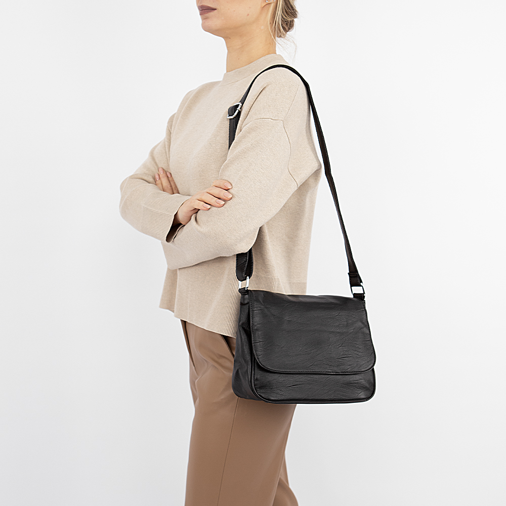 Сумка от торговой марки Passo Avanti из искусственной кожи черного цвета. Модель с несъемным регулируемым плечевым ремнем. Закрывается клапаном на магнитной кнопке. Отделение на молнии. Внутри: текстильная подкладка, средник и карман на молнии, накладной карман. На задней стороне – карман на молнии.