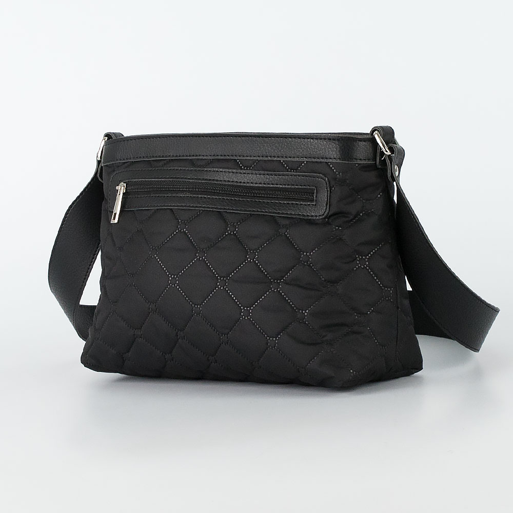 Сумка от торговой марки Galanteya из искусственной кожи и синтетического материала черного цвета. Декорирована блинтовым тиснением под ромбовидную стежку. Модель мягкой конструкции с широким несъемным плечевым ремнем. Отделение на молнии. Внутри: фирменная подкладка, накладной карман. На задней стороне – карман на молнии.