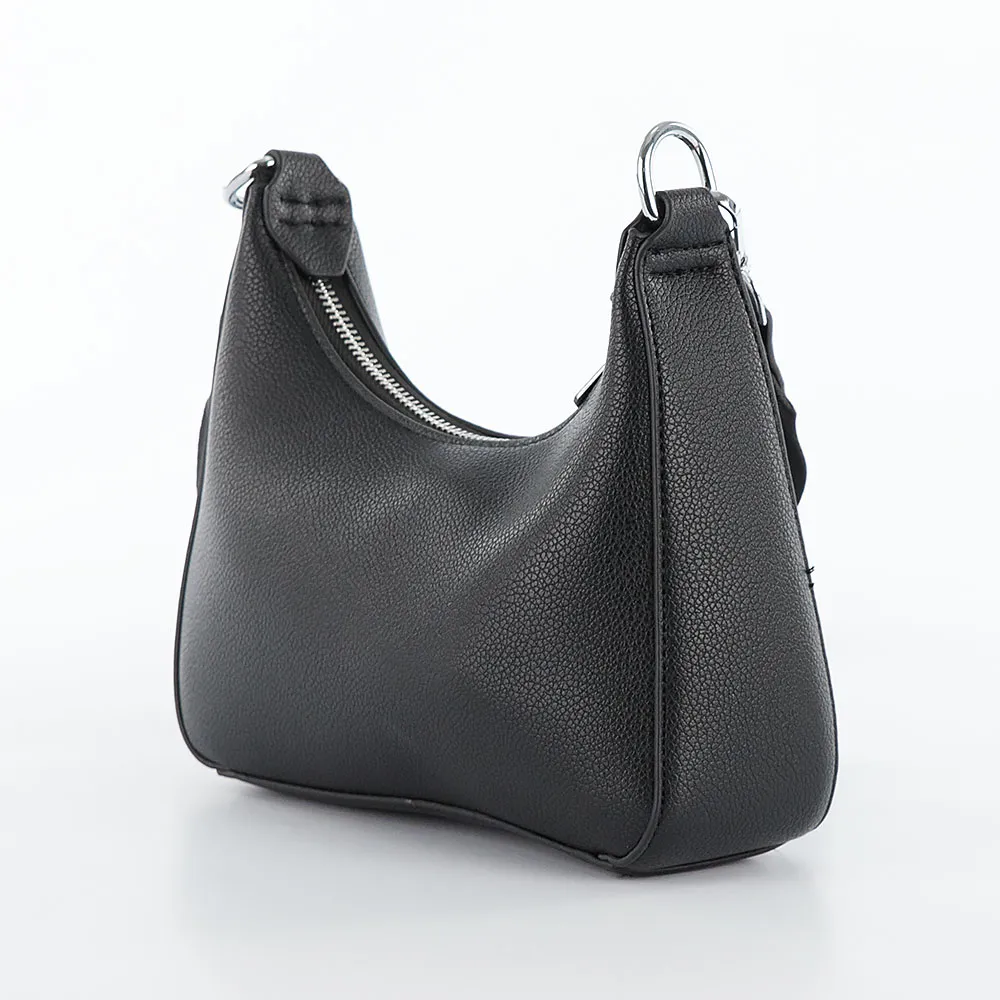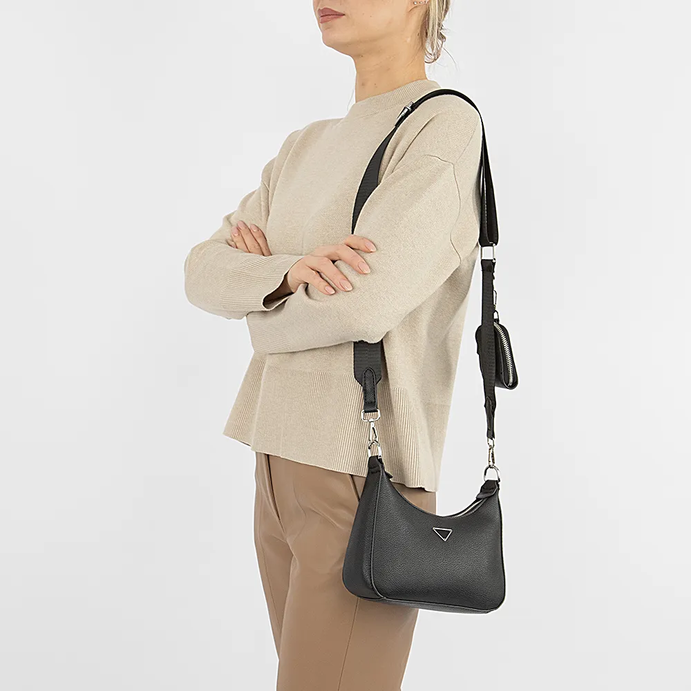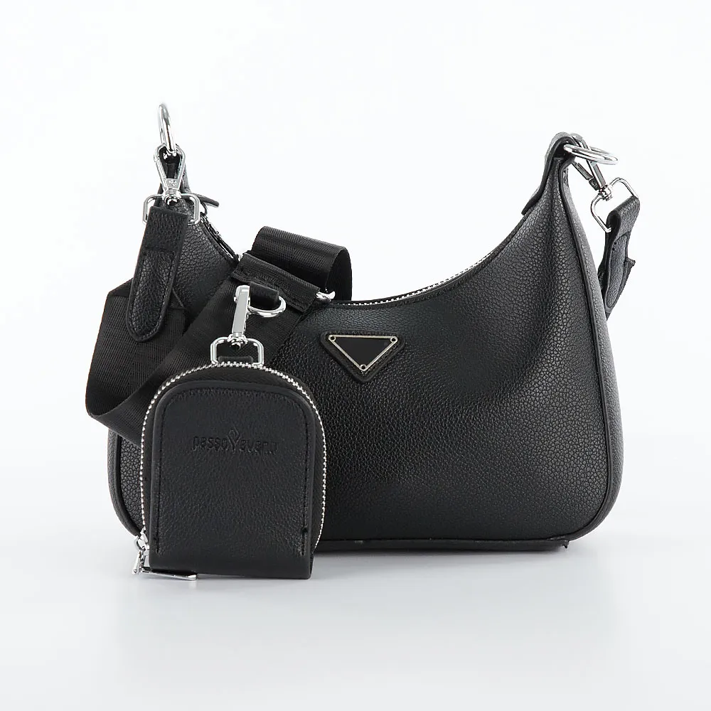 Сумка от торговой марки Passo Avanti из искусственной кожи черного цвета. Модель с широким съемным регулируемым плечевым ремнем, выполненным из текстильного материала. Отделение на молнии. Внутри: текстильная подкладка, карман на молнии, накладной карман. К ремню крепится кошелек с отделением на молнии без подкладки.