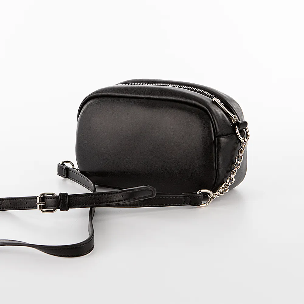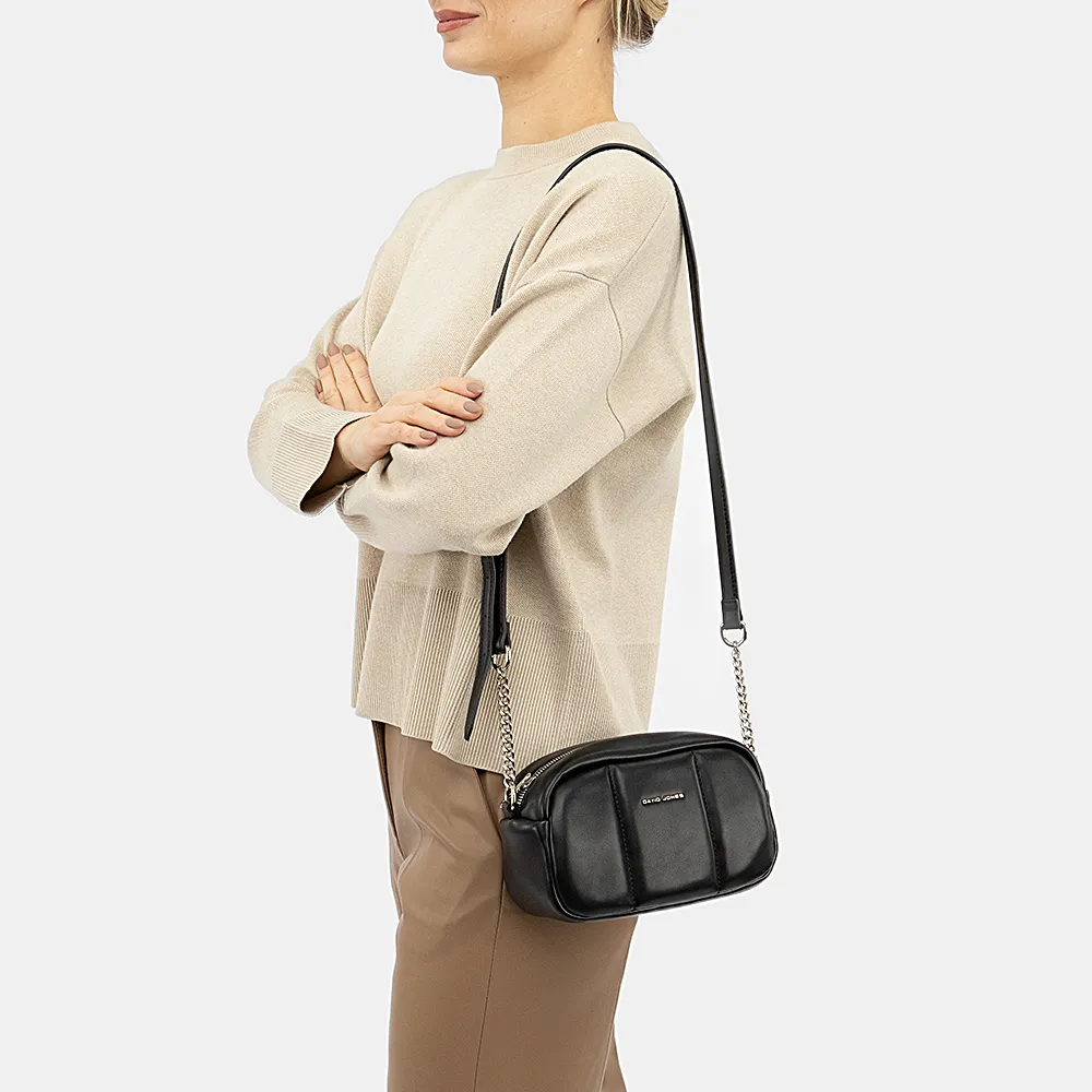 Сумка от торговой марки David Jones из искусственной кожи черного цвета. Лицевая сторона декорирована вертикальной строчкой. Модель с несъемным регулируемым плечевым ремнем-цепочкой. Отделение на молнии. Внутри: фирменная подкладка, карман на молнии, накладной карман.