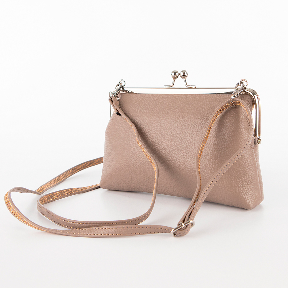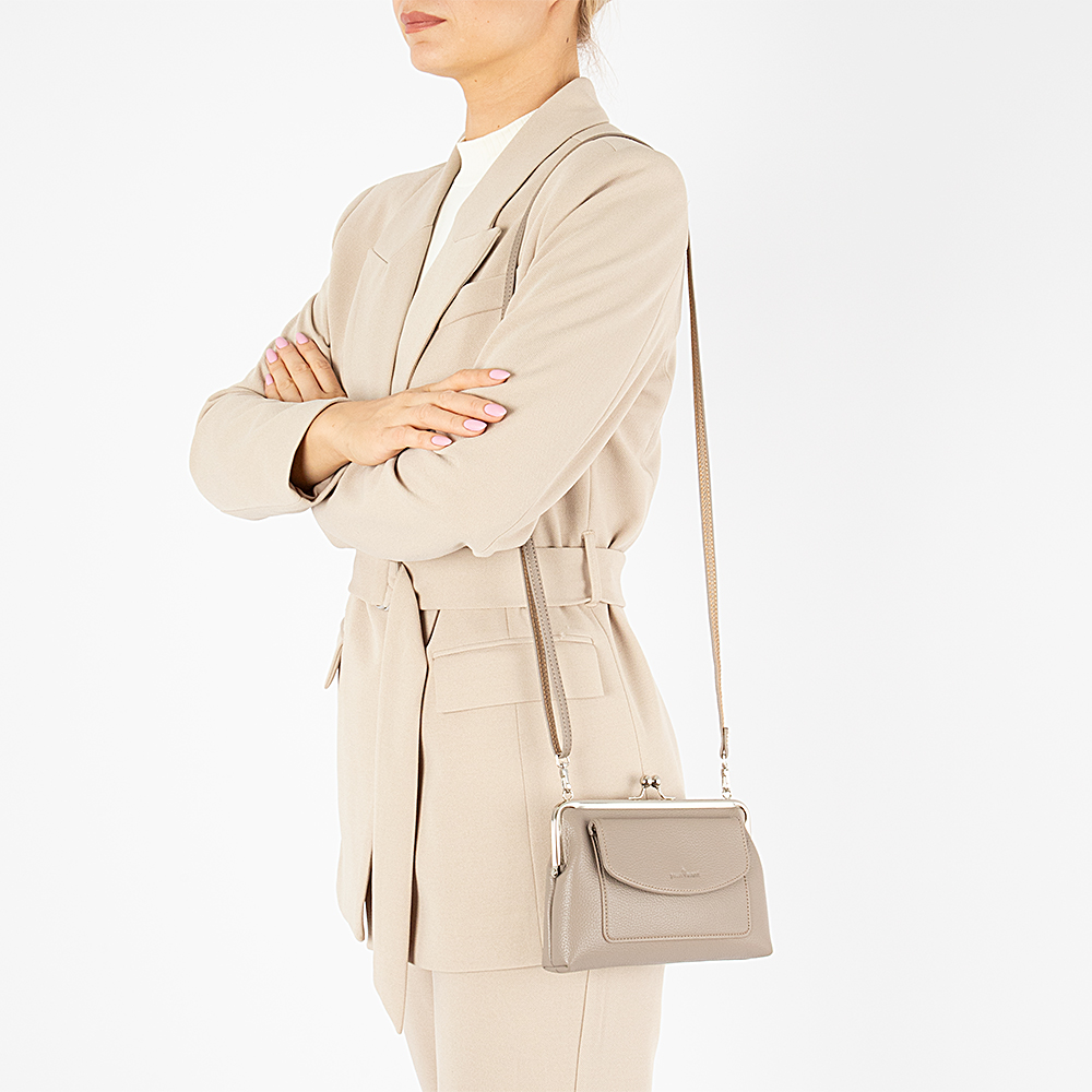 Сумка-кошелек от торговой марки Passo Avanti из искусственной кожи бежевого цвета. Модель со съемным регулируемым плечевым ремнем. Отделение с застежкой фермуар; внутри: текстильная подкладка, карман для карт. На лицевой стороне – накладной карман с клапаном на кнопке.
