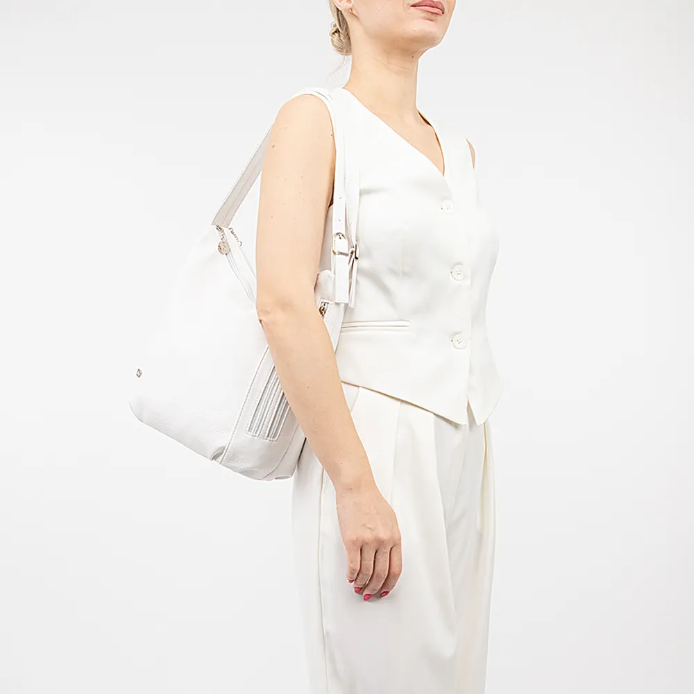Сумка от торговой марки Passo Avanti из искусственной кожи белого цвета. Модель с двумя удлиненными ручками. Два отделения на молнии, с текстильной подкладкой. В заднем отделении – карман на молнии, в переднем – два накладных кармана. Сбоку – два кармана на молнии. На задней стороне – карман на молнии.