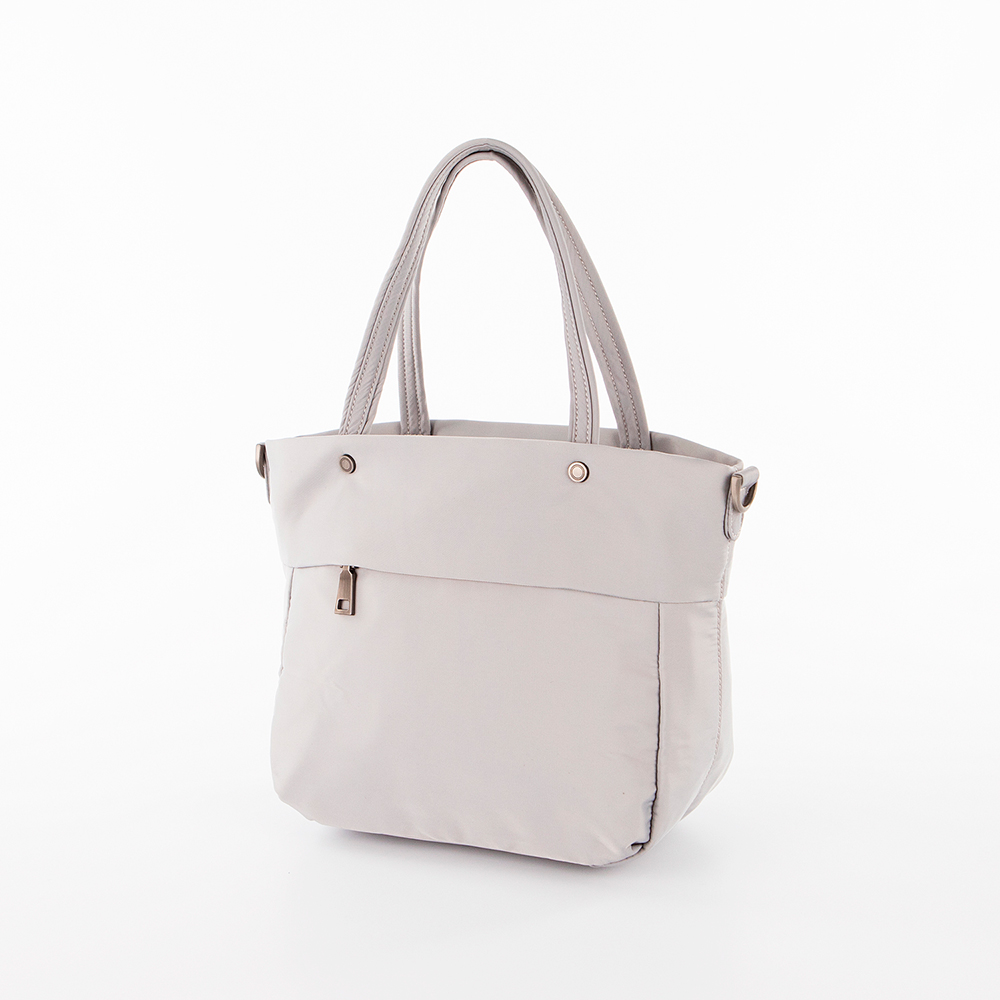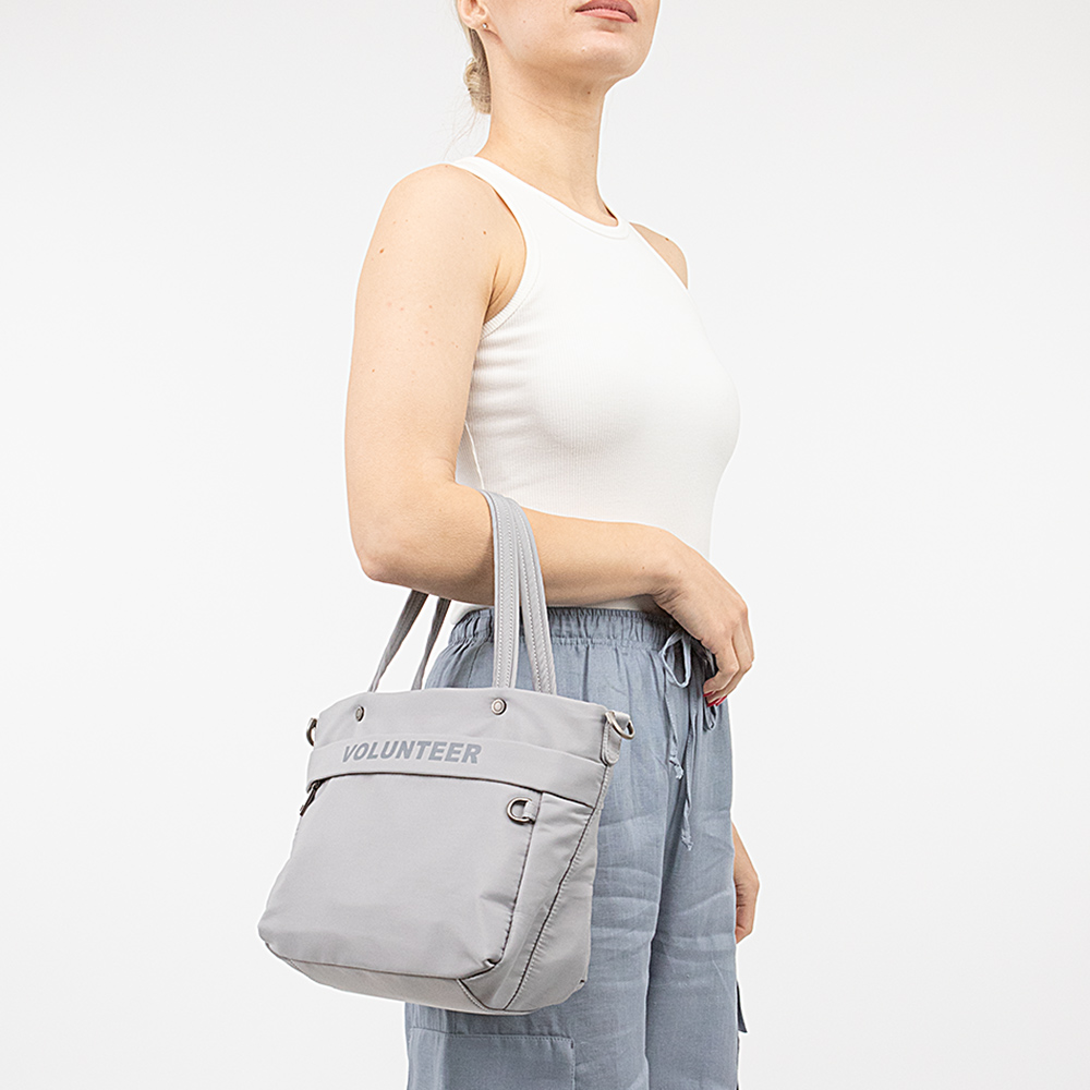 Сумка от торговой марки Volunteer из практичного прочного текстильного материала светло-серого цвета. Модель с двумя удлиненными ручками и съемным плечевым ремнем. Отделение на молнии. Внутри: текстильная подкладка, карман на молнии, два накладных кармана. На лицевой и задней сторонах – карман на молнии. Спереди имеется кольцо для крепления.