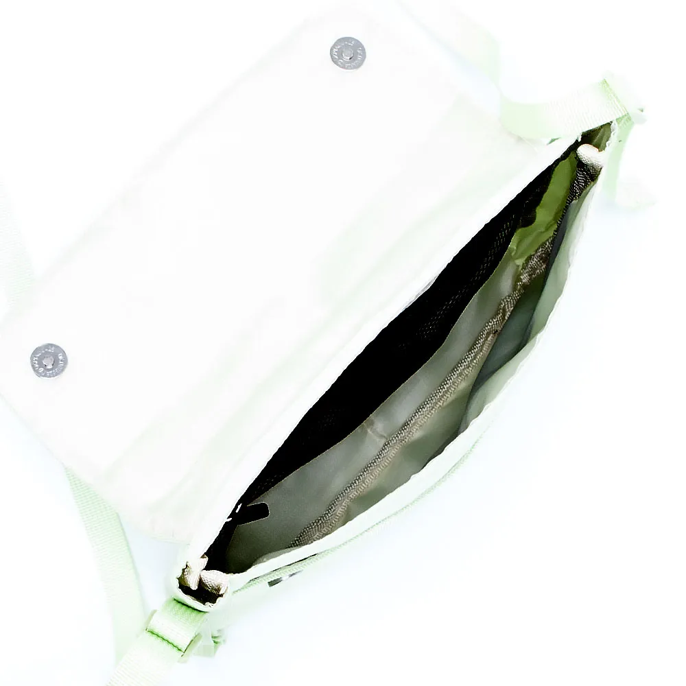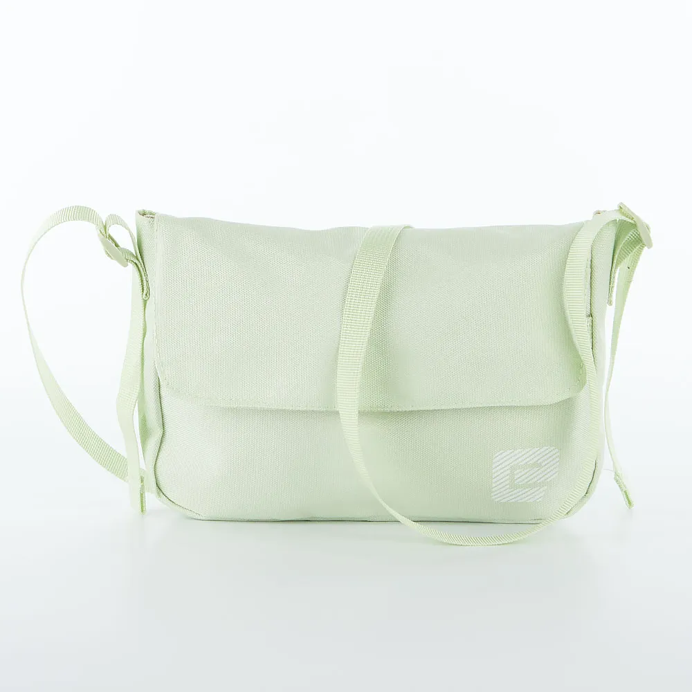 Сумка-планшет от торговой марки Ecotope из плотного текстильного материала светло-зеленого цвета. Плоская модель с несъемным регулируемым плечевым ремнем. Клапан на двух магнитных кнопках закрывает накладной карман и отделение. В отделении – карман-сетка на молнии. На задней стороне – карман на молнии.