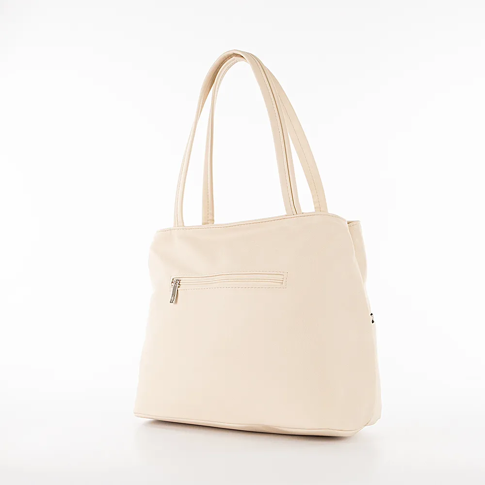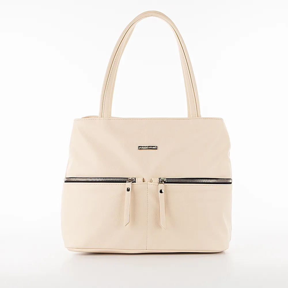 Сумка от торговой марки Passo Avanti из искусственной кожи бежевого цвета. Модель с двумя ручками. Два отделения на молнии, с текстильной подкладкой и карманами. На лицевой стороне – два кармана на молнии, на задней – карман на молнии.