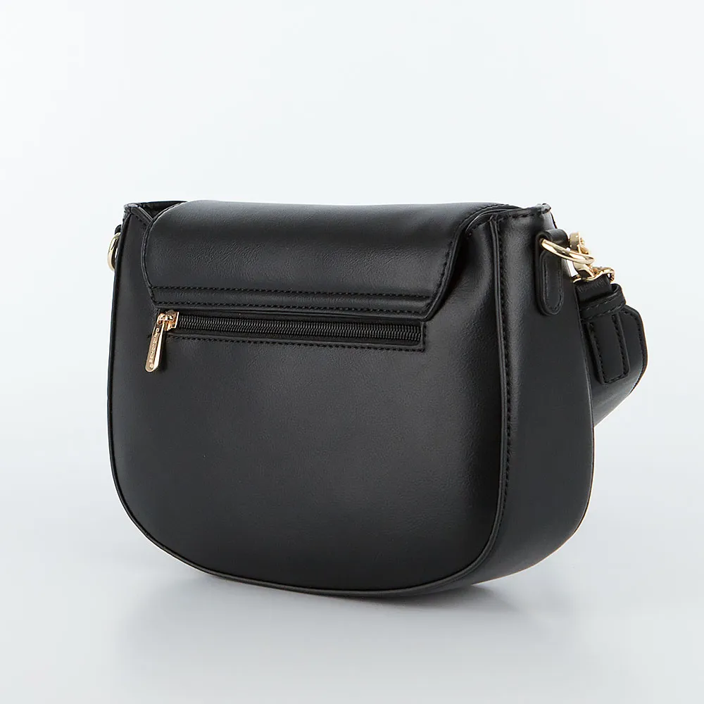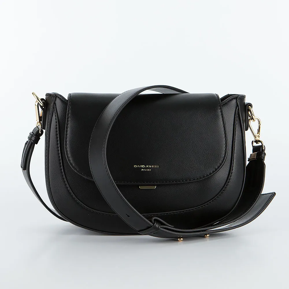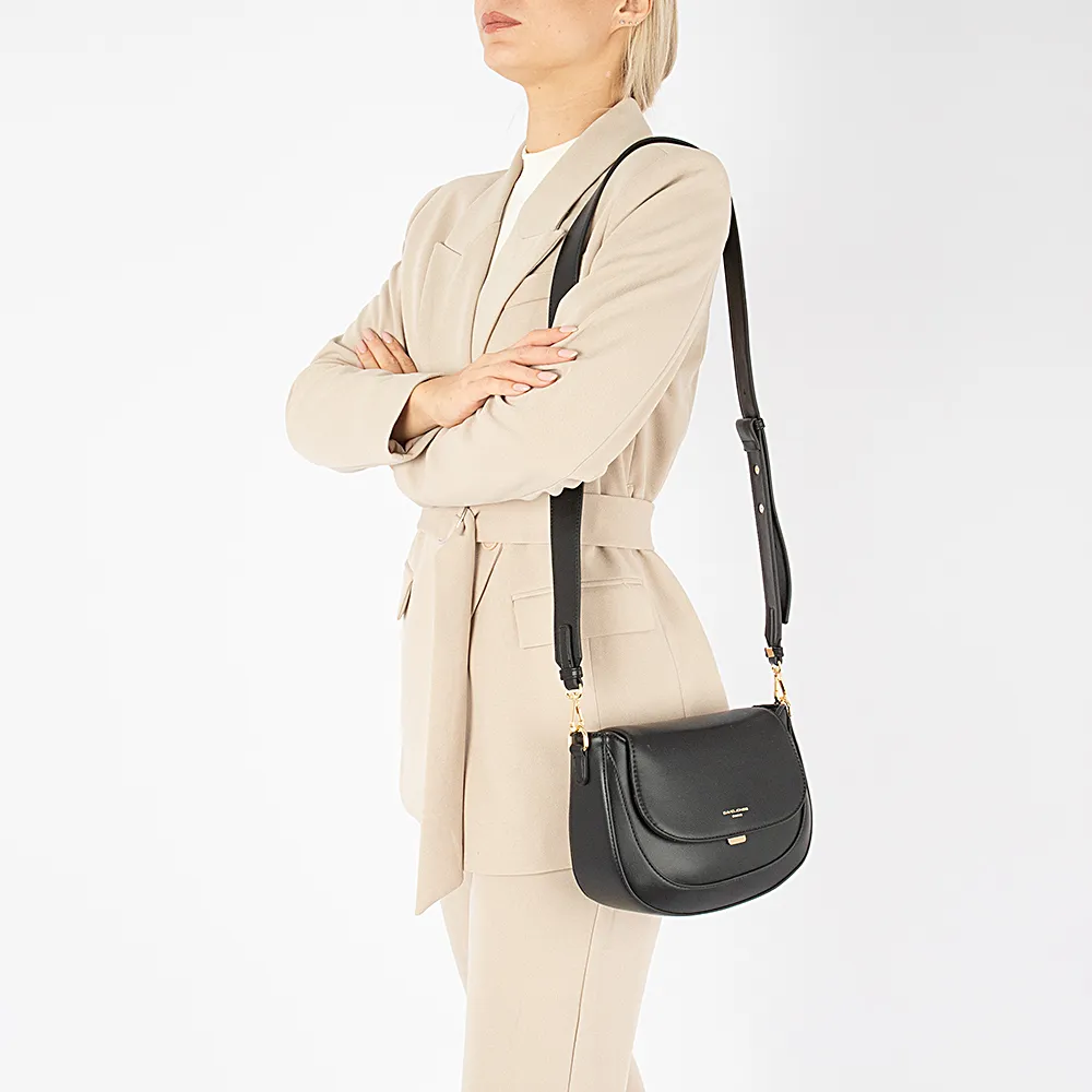 Сумка от торговой марки David Jones из искусственной кожи черного цвета. Модель с широким съемным регулируемым плечевым ремнем с кобурными кнопками. Закрывается клапаном на цупферном замке. Отделение на молнии. Внутри: фирменная подкладка, карман на молнии, накладной карман. На задней стороне – карман на молнии.
