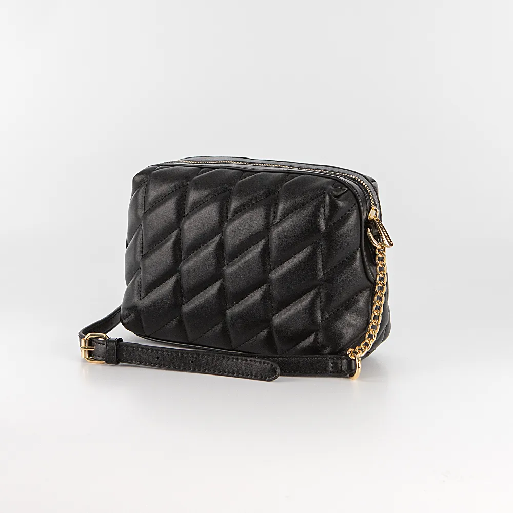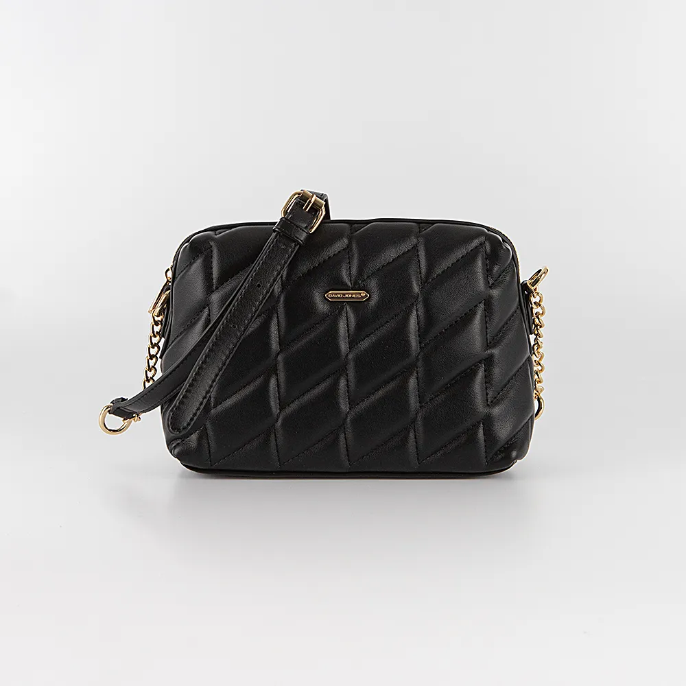 Сумка от торговой марки David Jones из искусственной кожи черного цвета. Декорирована мягкой объемной узорной стежкой. Модель с несъемным регулируемым плечевым ремнем-цепочкой. Отделение на молнии. Внутри: фирменная подкладка, карман на молнии, накладной карман.