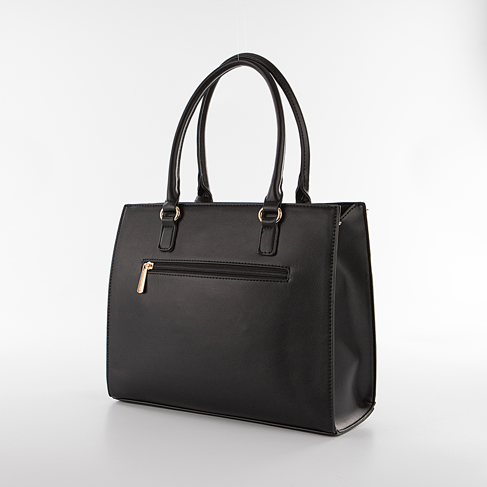 Сумка от торговой марки David Jones из искусственной кожи черного цвета. Лицевая сторона декорирована вставкой с тиснением под крокодиловую кожу. Модель с двумя плотными ручками с подвеской и съемным регулируемым плечевым ремнем. Отделение на молнии. Внутри: фирменная подкладка, карман на молнии, накладной карман. На задней стороне – карман на молнии.