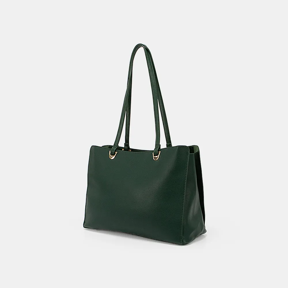 Сумка от торговой марки David Jones из искусственной кожи зеленого цвета. Модель с двумя удлиненными ручками. Три отделения с частичной подкладкой; крайние фиксируются магнитной кнопкой. Среднее отделение на молнии; внутри: карман на молнии, накладной карман. Дно оснащено металлическими ножками для защиты от износа.