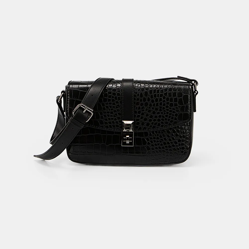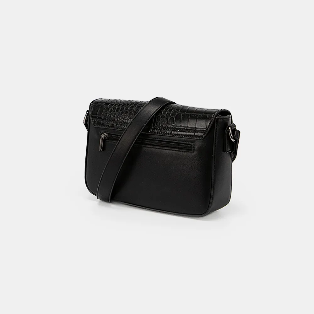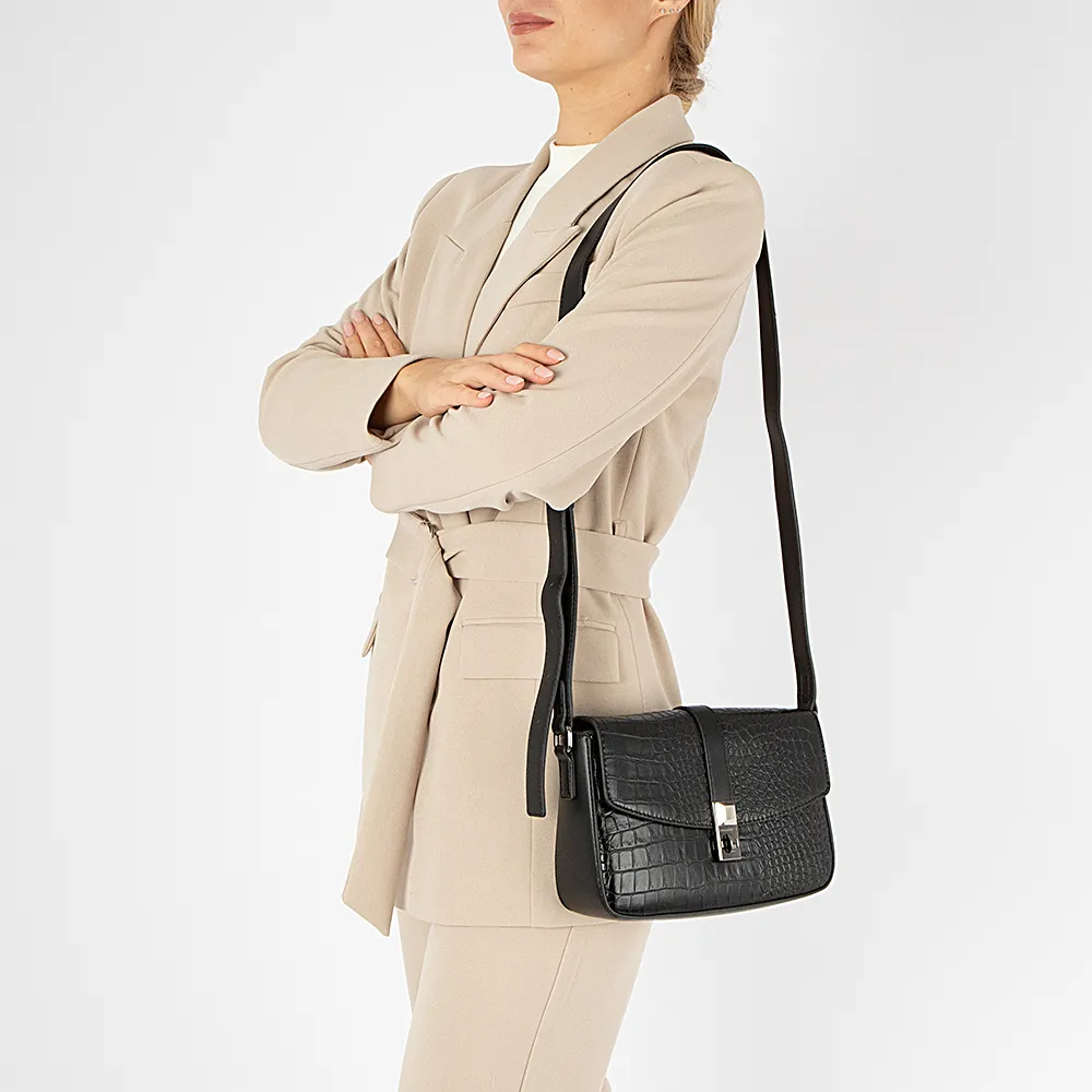 Сумка от торговой марки David Jones из искусственной кожи черного цвета. Модель с широким несъемным регулируемым плечевым ремнем. Закрывается клапаном на магнитной кнопке. Клапан декорирован тиснением под крокодиловую кожу. Отделение на молнии. Внутри: фирменная подкладка, карман на молнии, накладной карман. На задней стороне – карман на молнии.