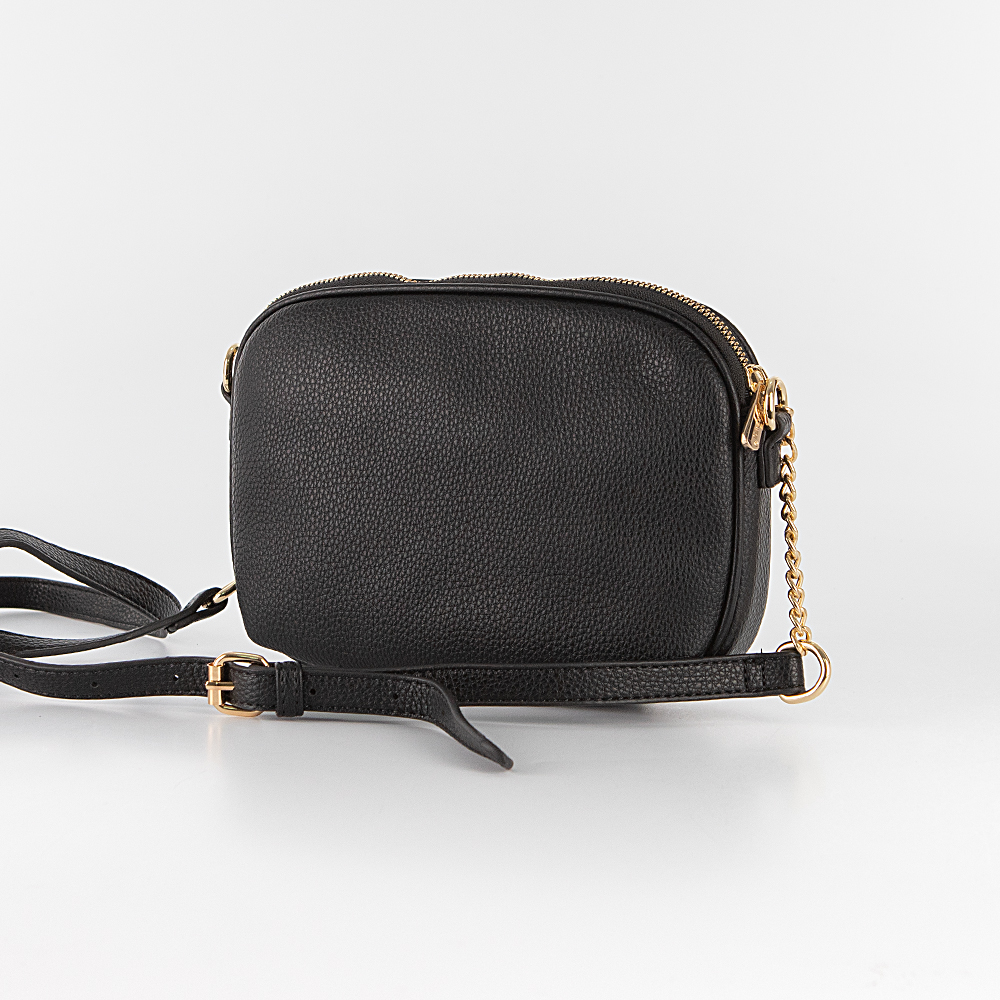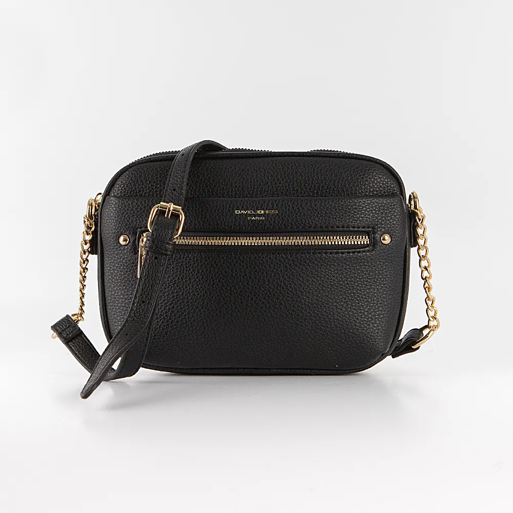 Сумка от торговой марки David Jones из искусственной кожи черного цвета. Модель с несъемным регулируемым плечевым ремнем-цепочкой. Отделение на молнии. Внутри: фирменная подкладка, карман на молнии, накладной карман. На лицевой стороне – карман на молнии, накладной карман на магнитной кнопке.