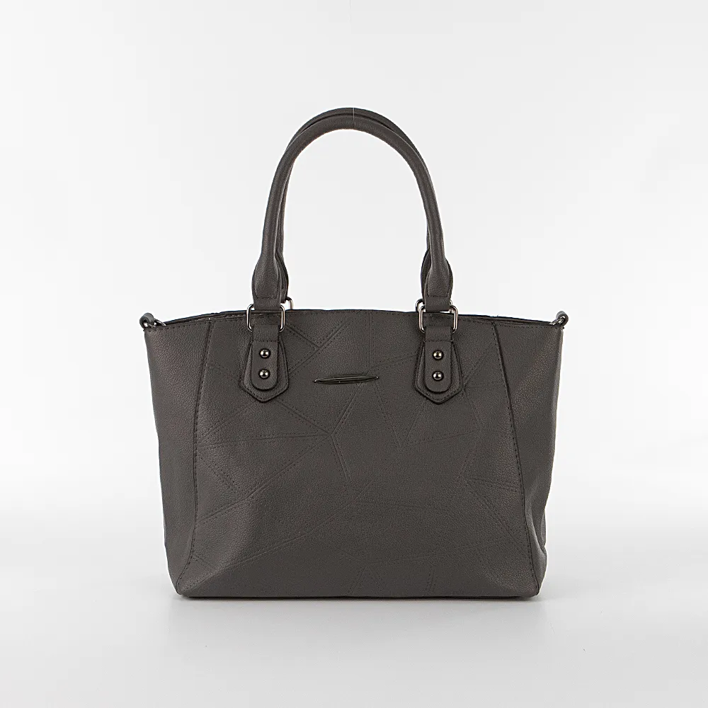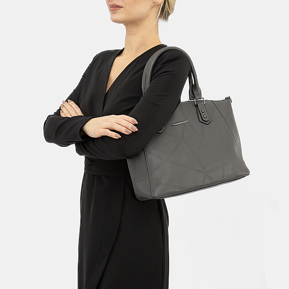 Сумка от торговой марки Passo Avanti из искусственной кожи серого цвета. Лицевая сторона декорирована отстрочкой с геометрическим рисунком. Модель с двумя ручками и съемным регулируемым плечевым ремнем. Отделение на молнии. Внутри: текстильная подкладка, средник и карман на молнии, накладной карман. На задней стороне – карман на молнии.