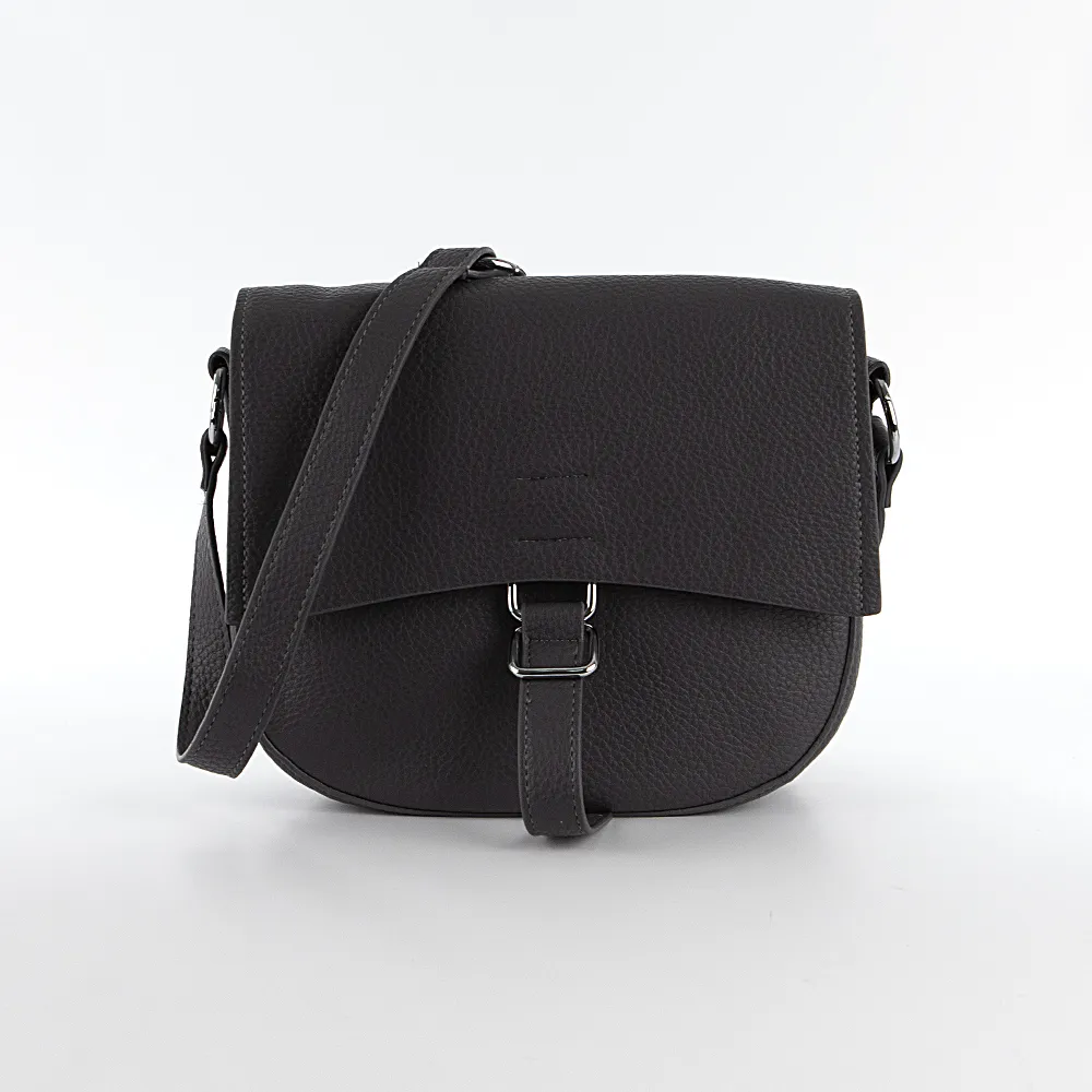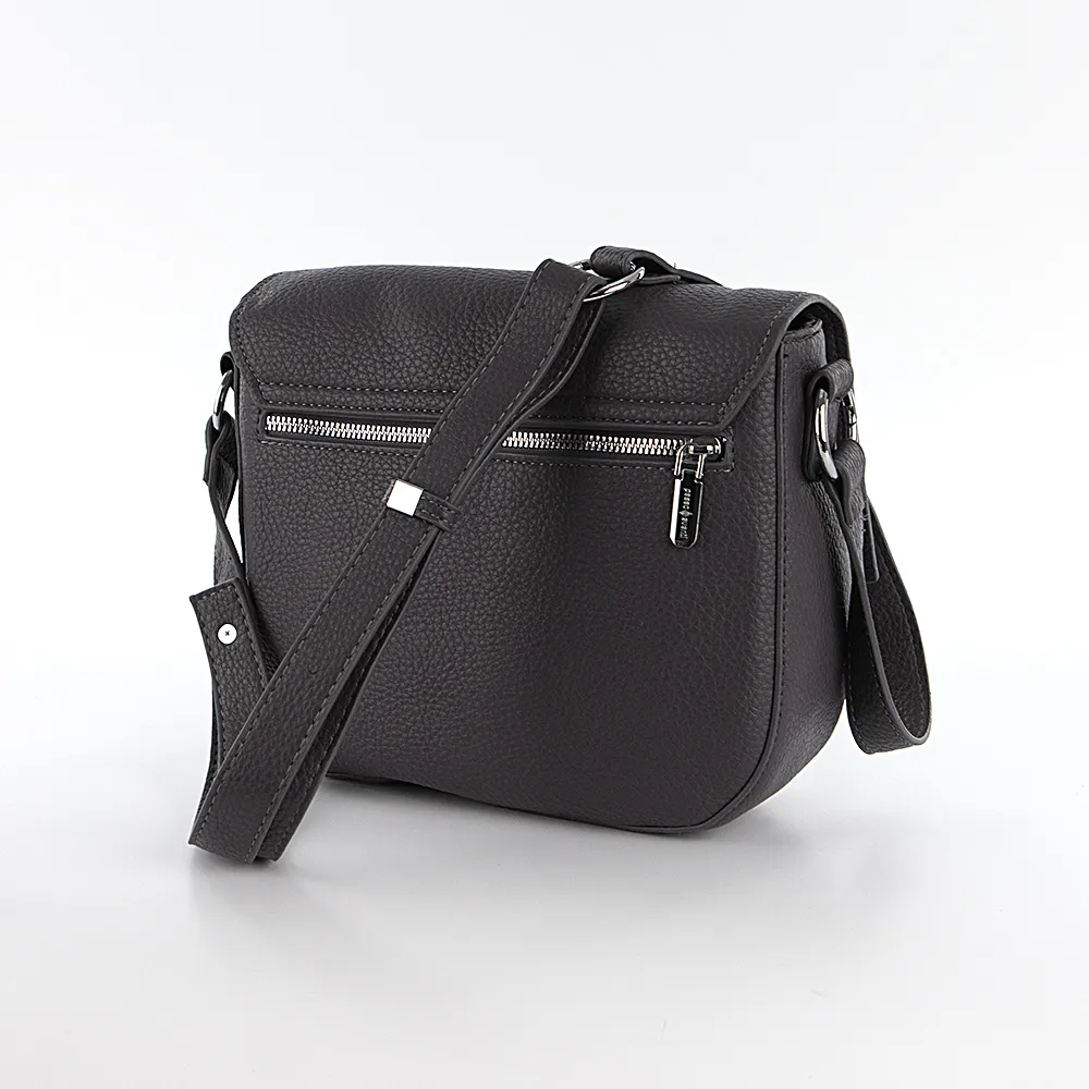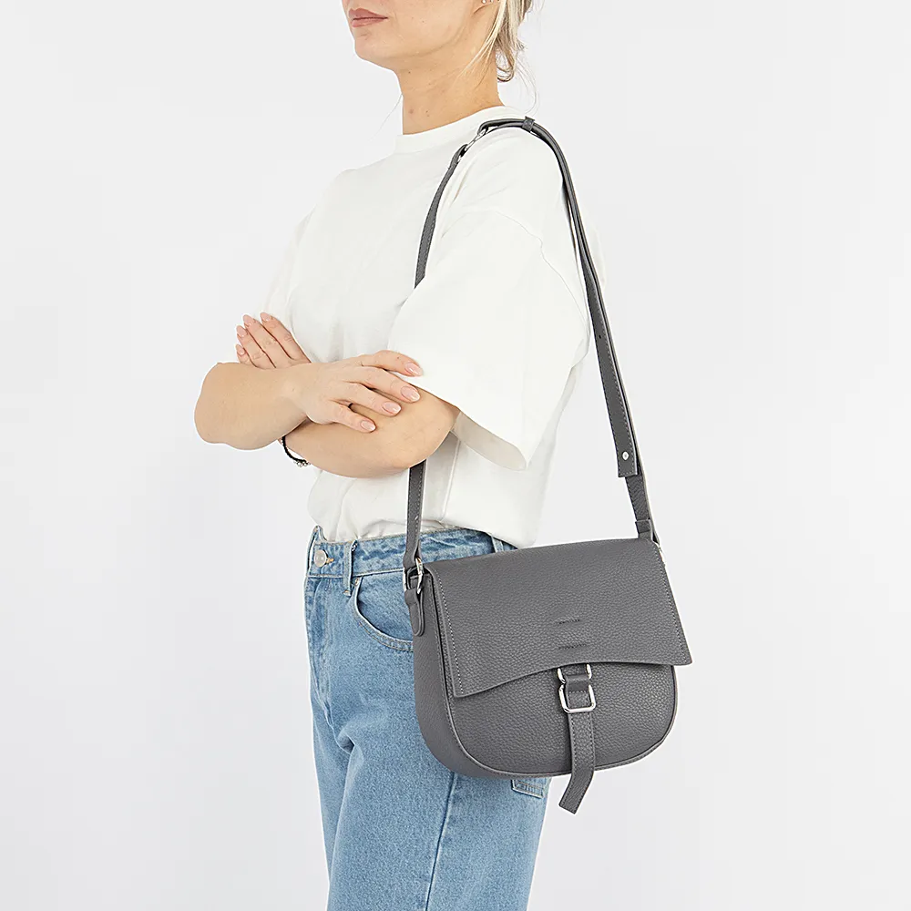 Сумка от торговой марки Passo Avanti из искусственной кожи серого цвета. Модель с несъемным регулируемым плечевым ремнем на кобурных кнопках. Закрывается клапаном на магнитной кнопке; фигурный клапан декорирован ремешком. Отделение на молнии. Внутри: текстильная подкладка, карман на молнии. На задней стороне – карман на молнии.