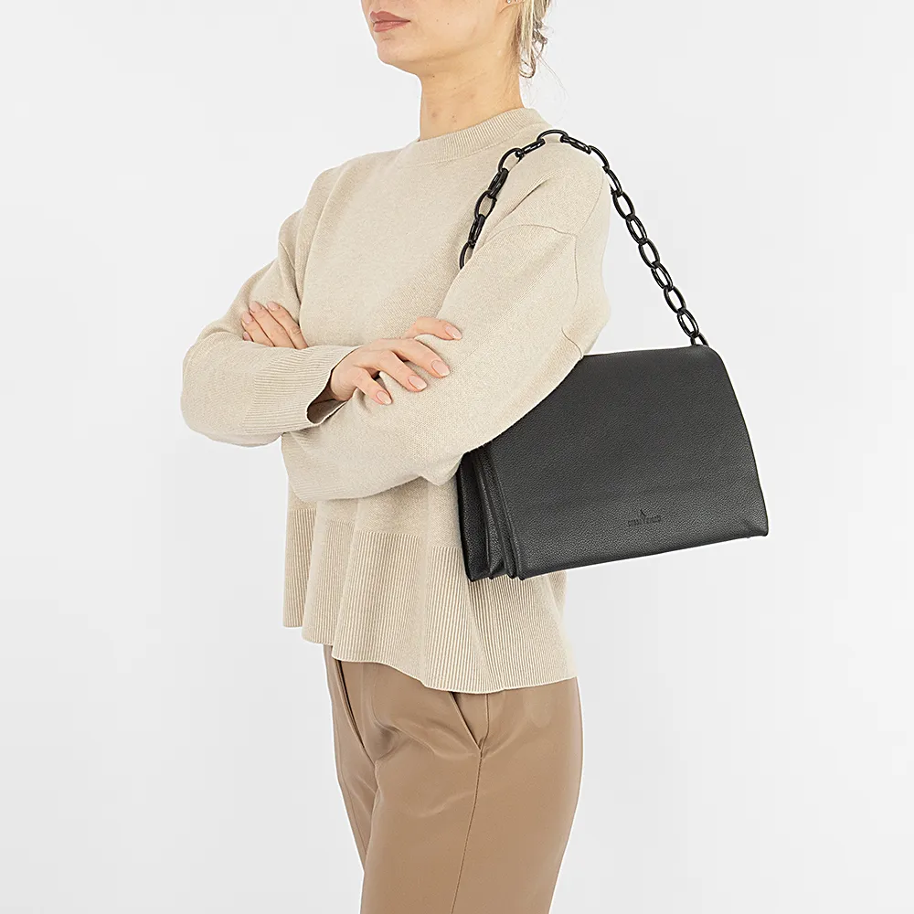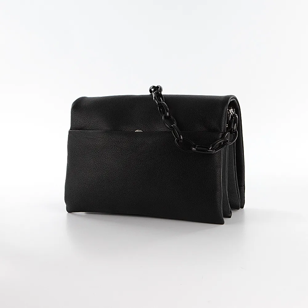 Сумка от торговой марки Passo Avanti из искусственной кожи черного цвета. Модель со съемным регулируемым плечевым ремнем, с декоративной ручкой-цепочкой из пластика. Клапан на двух магнитных кнопках закрывает три отделения с текстильной подкладкой, которые широко раскрываются, обеспечивая удобный доступ. Задний отсек фиксируются магнитной кнопкой. Средний отсек на молнии; внутри: карман на молнии, накладной карман.