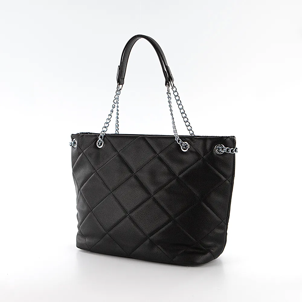 Сумка от торговой марки Passo Avanti из искусственной кожи черного цвета с ромбовидной стежкой. Модель с двумя удлиненными ручками-цепочками. Отделение на молнии. Внутри: текстильная подкладка, карман на молнии, накладной карман. Дно оснащено металлическими ножками для защиты от износа.
