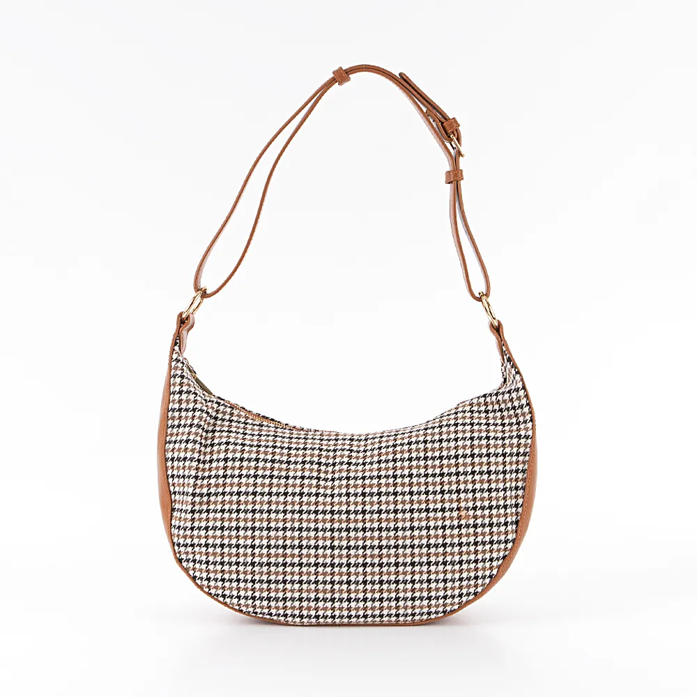 Сумка от торговой марки Marzia из текстильного материала с принтом «в клетку» и искусственной кожи коричневого цвета. Модель с регулируемой ручкой-ремнем. Отделение на молнии. Внутри: текстильная подкладка, карман на молнии, накладной карман.