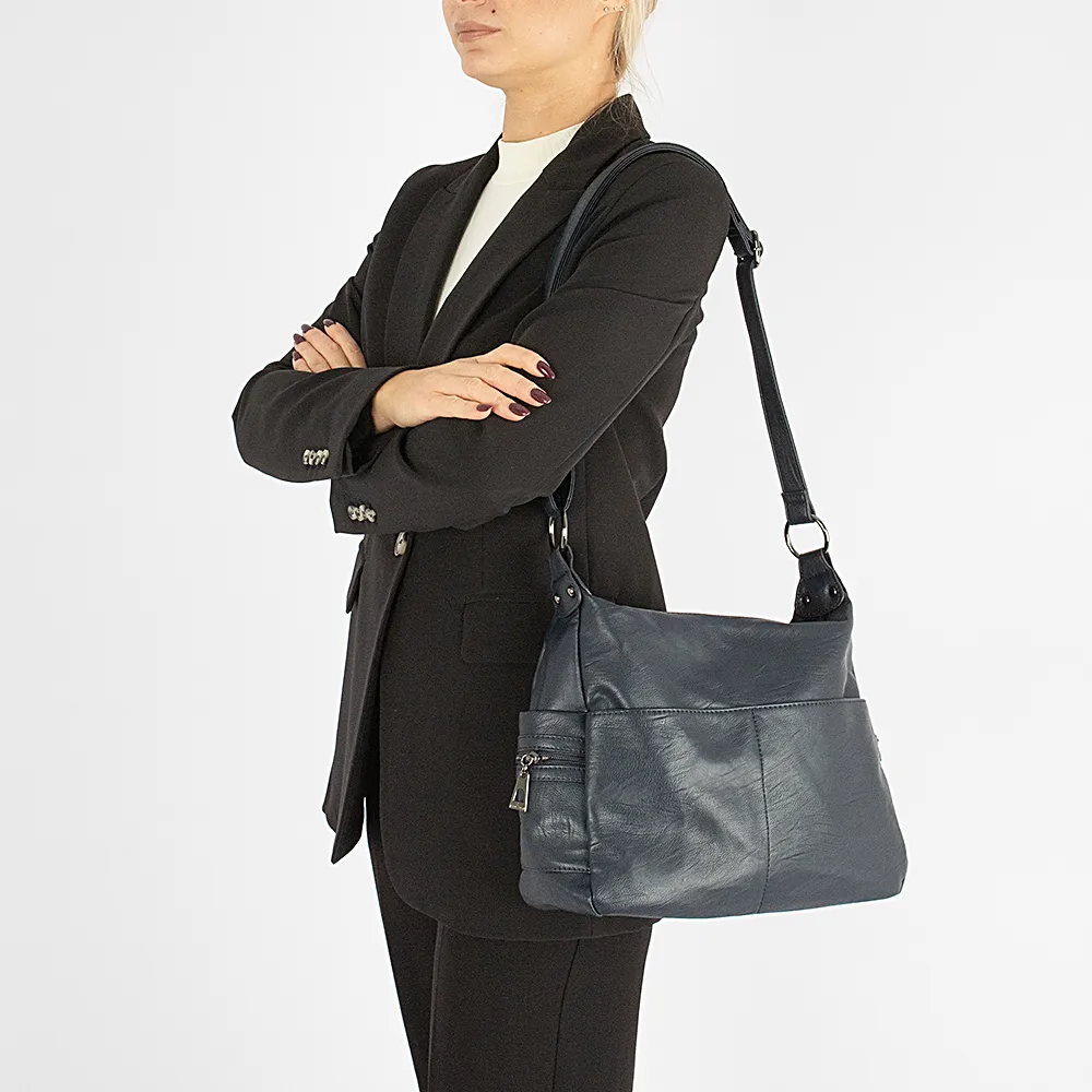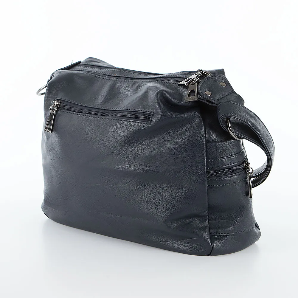 Сумка от торговой марки Passo Avanti из искусственной кожи синего цвета. Модель с несъемным регулируемым плечевым ремнем. Два отделения на молнии с текстильной подкладкой. В одном из них – карман на молнии, в другом – накладной карман. На лицевой стороне – два накладных кармана на магнитной кнопке. На задней стороне – карман на молнии. По бокам – карманы: без застежки и на молнии.