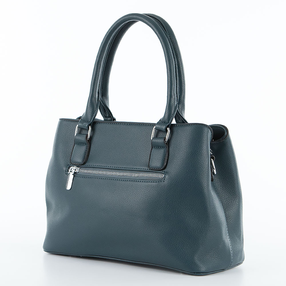 Сумка от торговой марки Passo Avanti из искусственной кожи синего цвета. Модель с двумя ручками и съемным плечевым ремнем. Отделение на молнии. Внутри: текстильная подкладка, средник и карман на молнии, два накладных кармана. На задней стороне – карман на молнии. Дно оснащено металлическими ножками для защиты от износа.