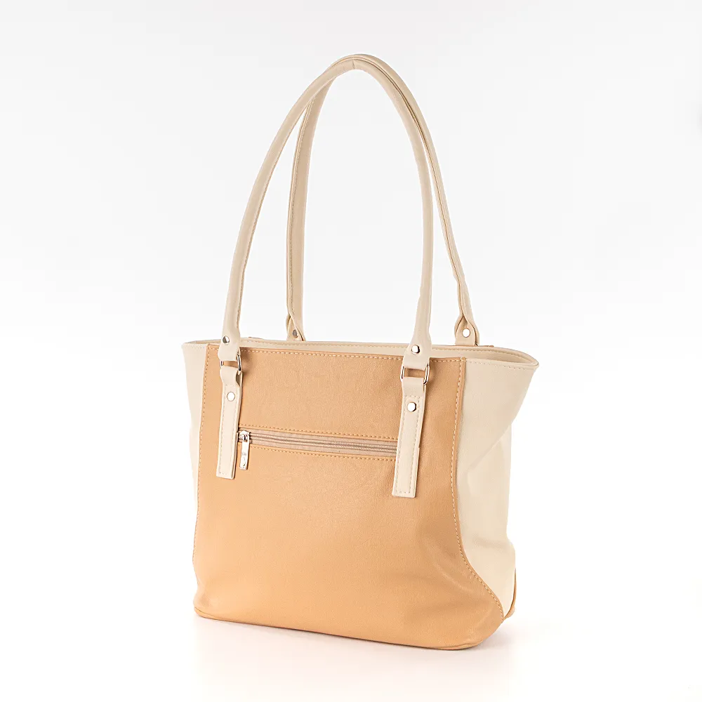 Сумка от торговой марки Passo Avanti из искусственной кожи в оттенках бежевого цвета. Модель с двумя удлиненными ручками. Отделение на молнии. Внутри: текстильная подкладка, карман на молнии, накладной карман, перегородка с карманом на молнии, образующая накладной карман. На задней стороне – карман на молнии.