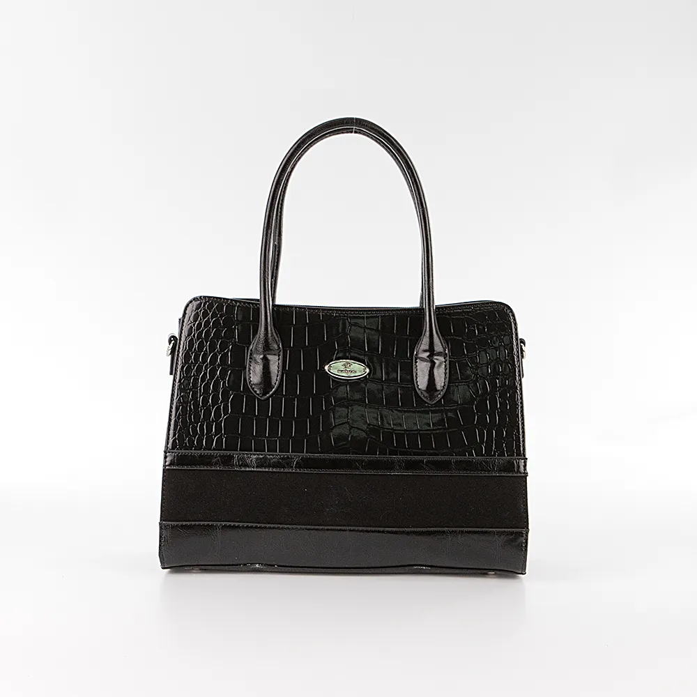 Сумка от торговой марки Marzia из искусственной кожи черного цвета. Лицевая сторона декорирована лакированной вставкой с тиснением под крокодиловую кожу и бархатистой вставкой. Модель с двумя ручками и съемным плечевым ремнем. Отделение на молнии. Внутри: фирменная подкладка, средник и карман на молнии, два накладных кармана. На задней стороне - карман на молнии. Дно оснащено металлическими ножками для защиты от износа.
