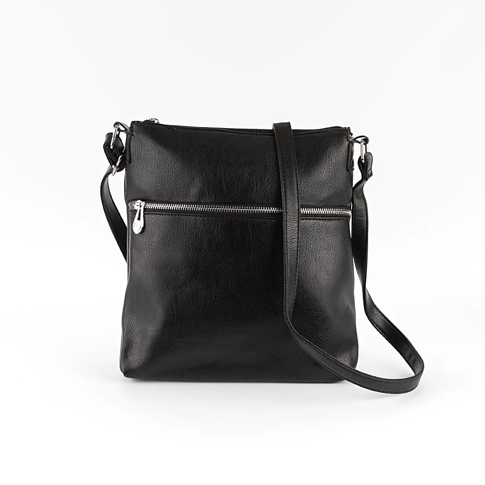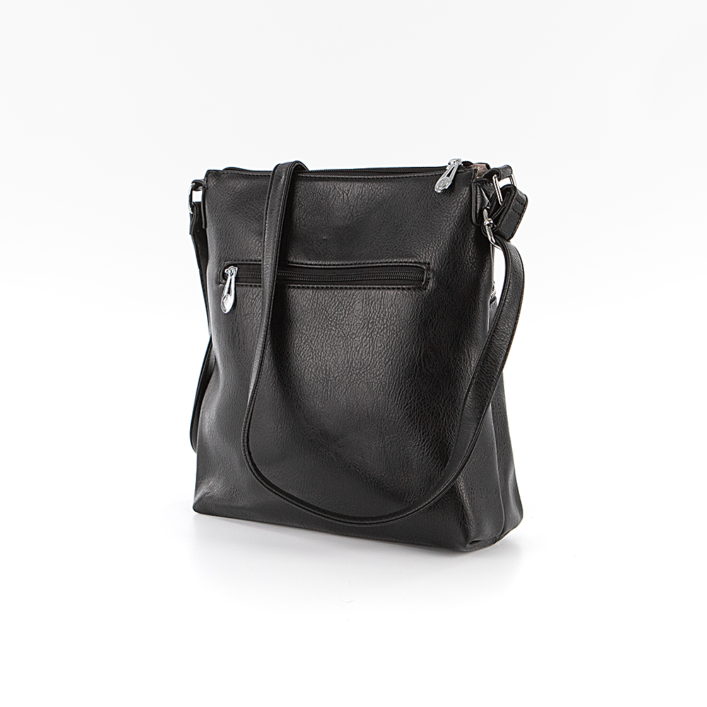 Сумка от торговой марки Passo Avanti из искусственной кожи черного цвета. Модель с несъемным регулируемым плечевым ремнем. Отделение на молнии. Внутри: текстильная подкладка, карман на молнии, два накладных кармана. На лицевой и задней сторонах – карман на молнии.