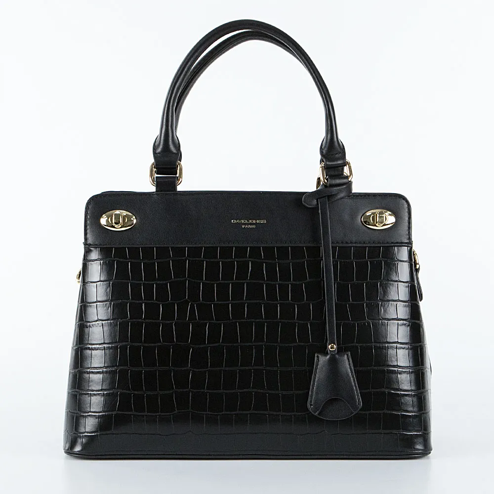 Сумка от торговой марки David Jones из искусственной кожи черного цвета с тиснением под крокодиловую кожу. Модель с двумя ручками, декорированными подвеской, и съемным регулируемым плечевым ремнем. Отделение на молнии. Внутри: средник и карман на молнии, накладной карман. На лицевой стороне – декоративные элементы. На задней стороне – карман на молнии.