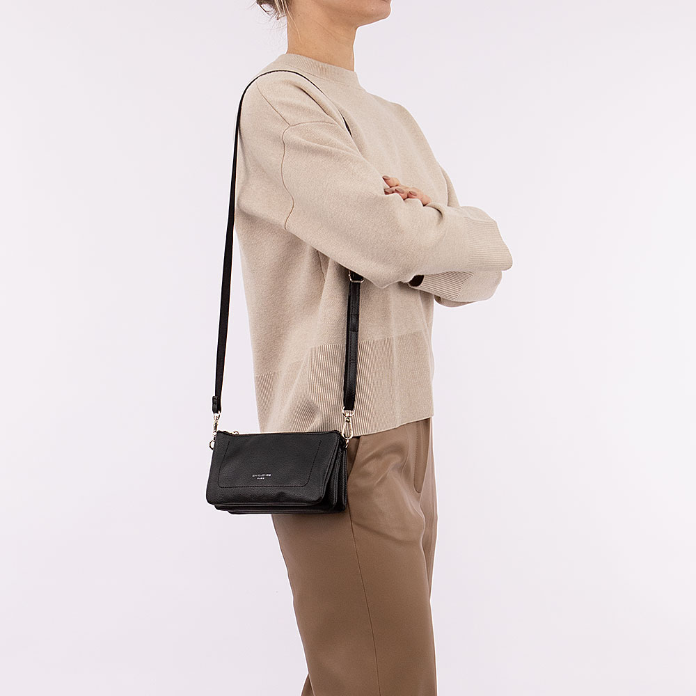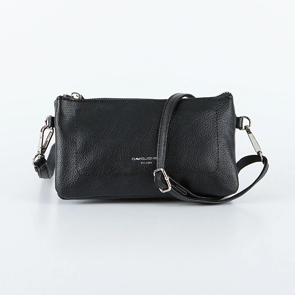 Сумка от торговой марки David Jones из искусственной кожи черного цвета. Компактная модель кросс-боди со съемным регулируемым плечевым ремнем. Закрывается молнией. Внутри: три отсека с фирменной подкладкой, в заднем отсеке – карман на молнии.