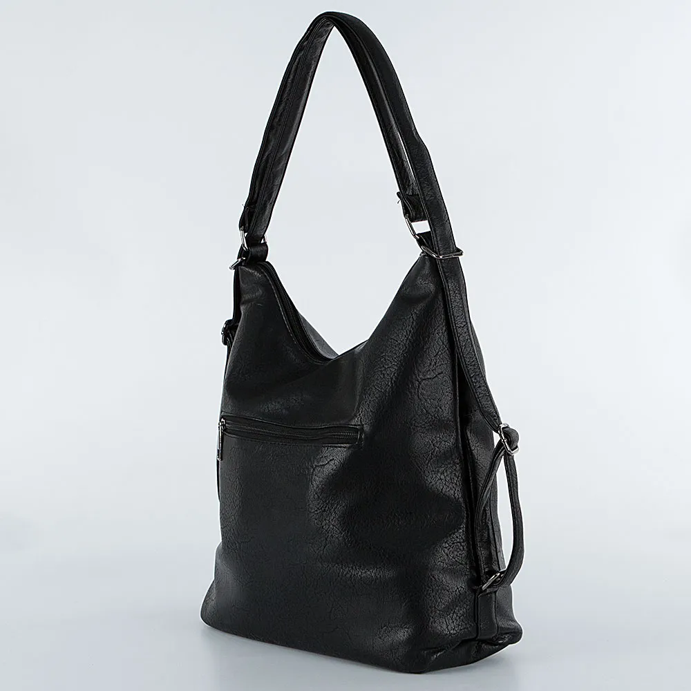 Сумка-рюкзак от торговой марки Passo Avanti из искусственной кожи черного цвета. Модель с двумя ручками, которые стягиваются в плечевые лямки. Отделение на молнии. Внутри: текстильная подкладка, средник и карман на молнии, два накладных кармана. На лицевой и задней сторонах – карман на молнии. Дно сумки овальной формы.