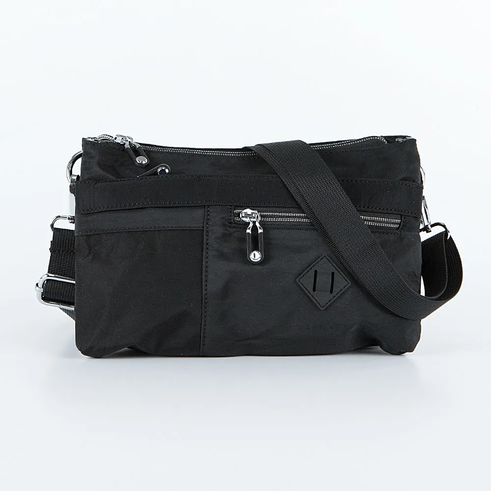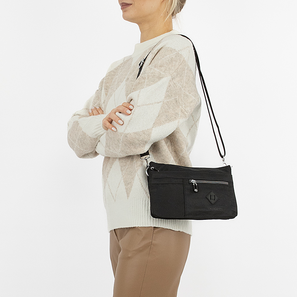 Сумка от торговой марки Valigetti из текстильного материала черного цвета. Модель со съемным регулируемым плечевым ремнем. Закрывается молнией. Внутри: три отсека, текстильная подкладка; в одном из отделений – карман на молнии, в другом – два накладных кармана. На лицевой стороне – два кармана на молнии, кармашек без застежки. На задней стороне – карман на молнии.