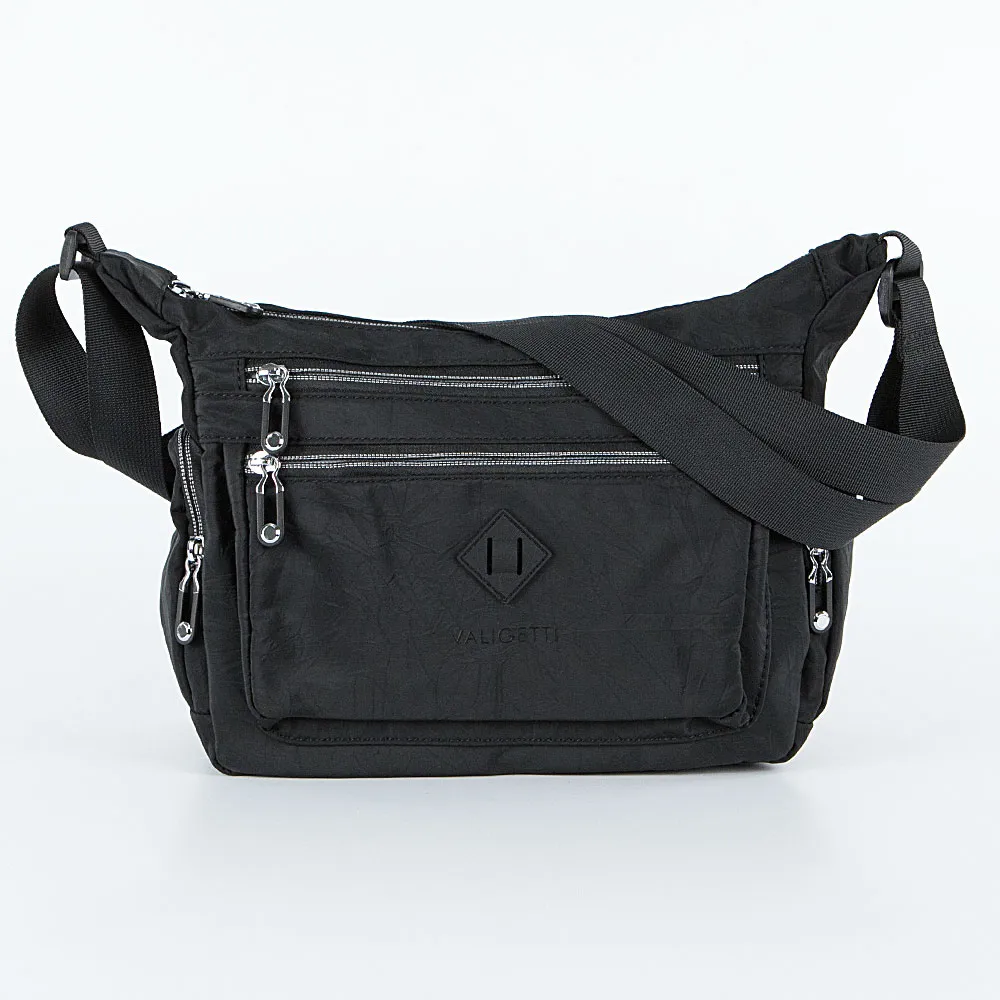 Сумка от торговой марки Valigetti из текстильного материала черного цвета. Модель с несъемным регулируемым плечевым ремнем. Отделение на молнии. Внутри: фирменная подкладка, карман на молнии, два накладных кармана. Снаружи имеется пять карманов на молнии: спереди, по бокам и на задней стороне.