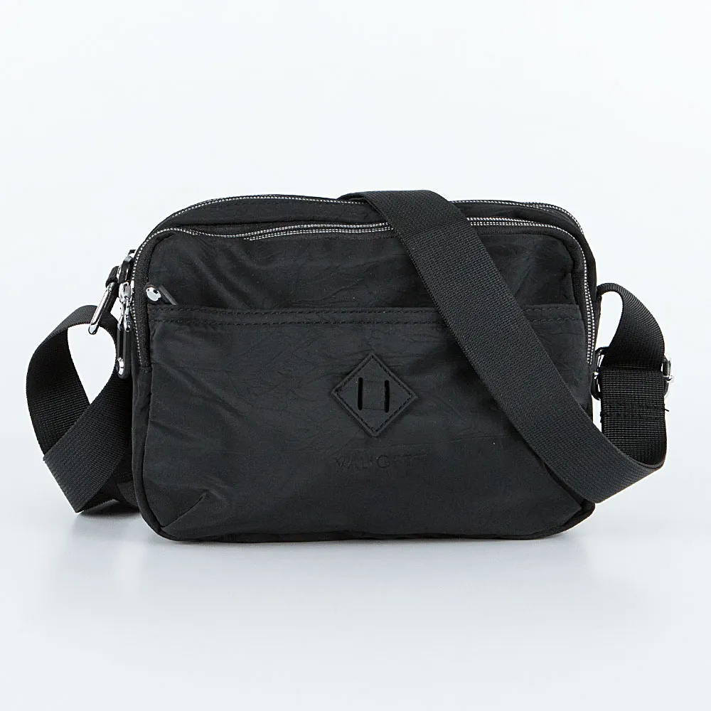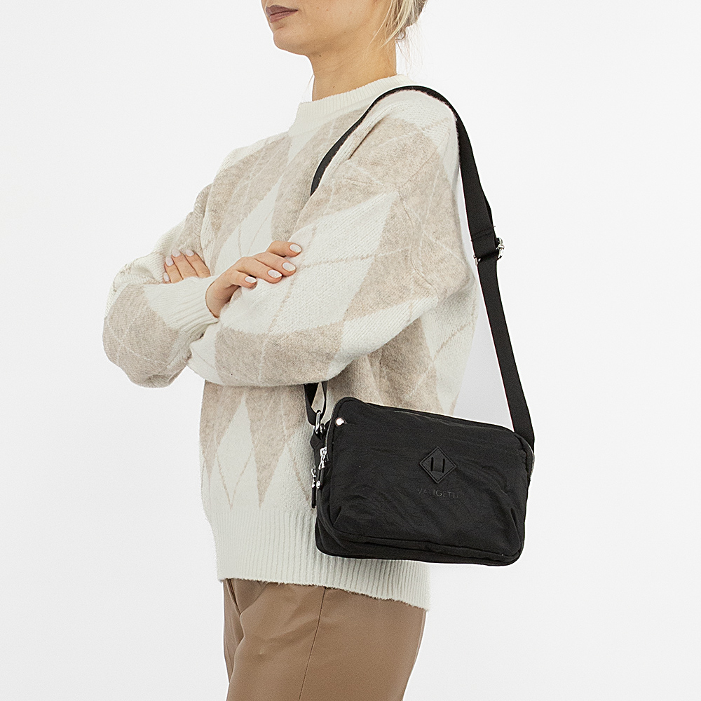 Сумка от торговой марки Valigetti из текстильного материала черного цвета. Компактная модель с несъемным регулируемым плечевым ремнем. Три отделения на молнии, с текстильной подкладкой. В одном из отделений – карман на молнии. На лицевой и задней сторонах - карман на скрытой молнии.