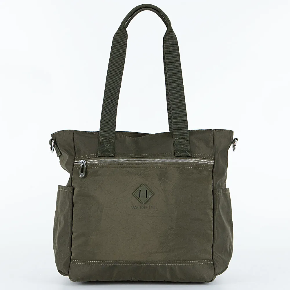Сумка от торговой марки Valigetti из практичного текстильного материала цвета хаки. Модель с двумя удлиненными ручками и съемным регулируемым плечевым ремнем. Отделение на молнии. Внутри: фирменная подкладка, карман на молнии, два накладных кармана. На лицевой стороне – карман на молнии. По бокам – карман без застежки. На задней стороне – карман на молнии.