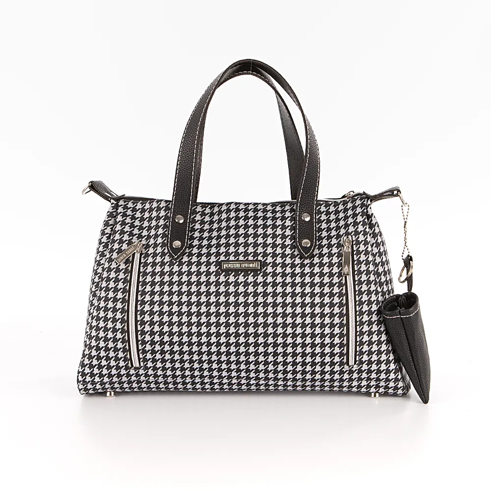 Сумка от торговой марки Passo Avanti из текстильного материала и искусственной кожи в сочетании черного и белого цвета с принтом «гусиная лапка». Модель с двумя ручками и съемным плечевым ремнем. Отделение на молнии. Внутри: текстильная подкладка, карман на молнии, два накладных кармана. На лицевой стороне – два кармана на молнии. На задней стороне – карман на молнии. Дно оснащено металлическими ножками для защиты от износа. В комплекте имеется ключница с отделением без застежки.