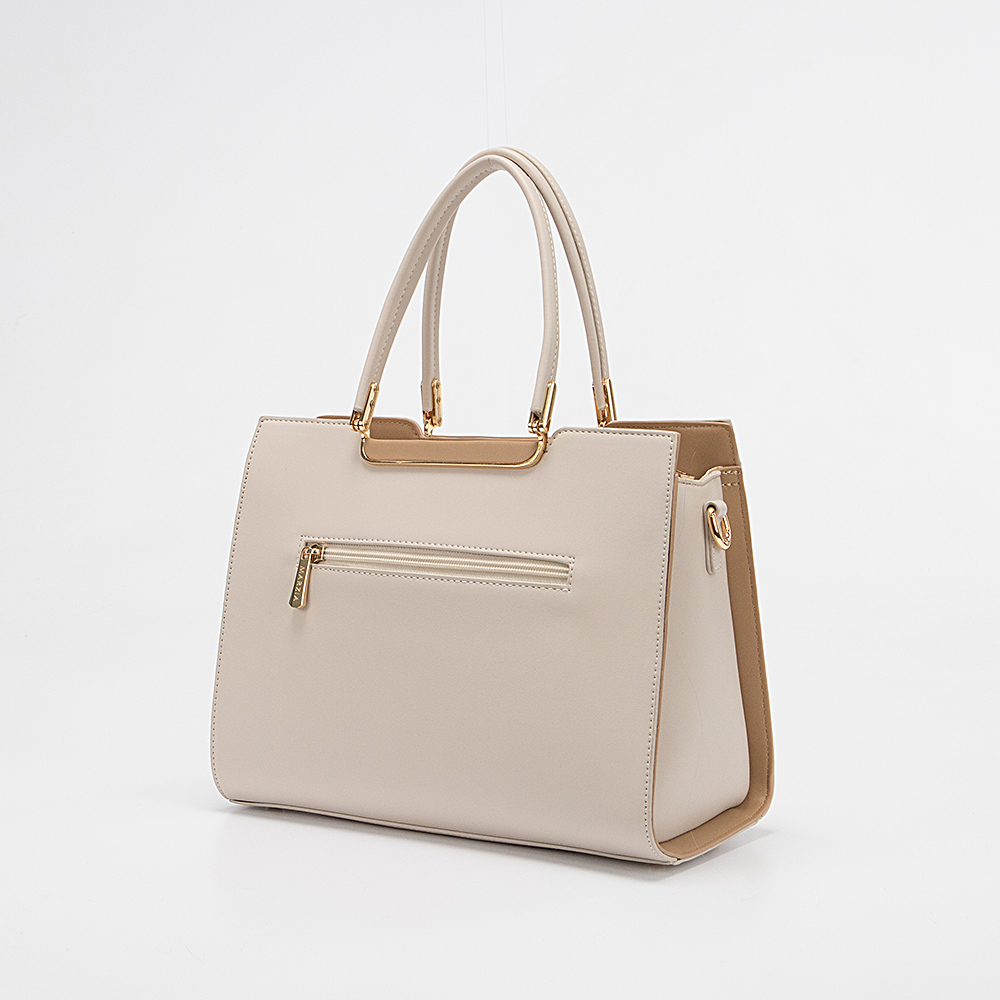 Сумка от торговой марки Marzia из искусственной кожи бежевого цвета. Декорирована оригинальным тиснением, чередующимся вертикальными полосами. Модель с двумя удлиненными ручками и съемным регулируемым плечевым ремнем. Отделение на молнии. Внутри: текстильная подкладка, средник и карман на молнии. На задней стороне – карман на молнии. Дно оснащено металлическими ножками для защиты от износа.