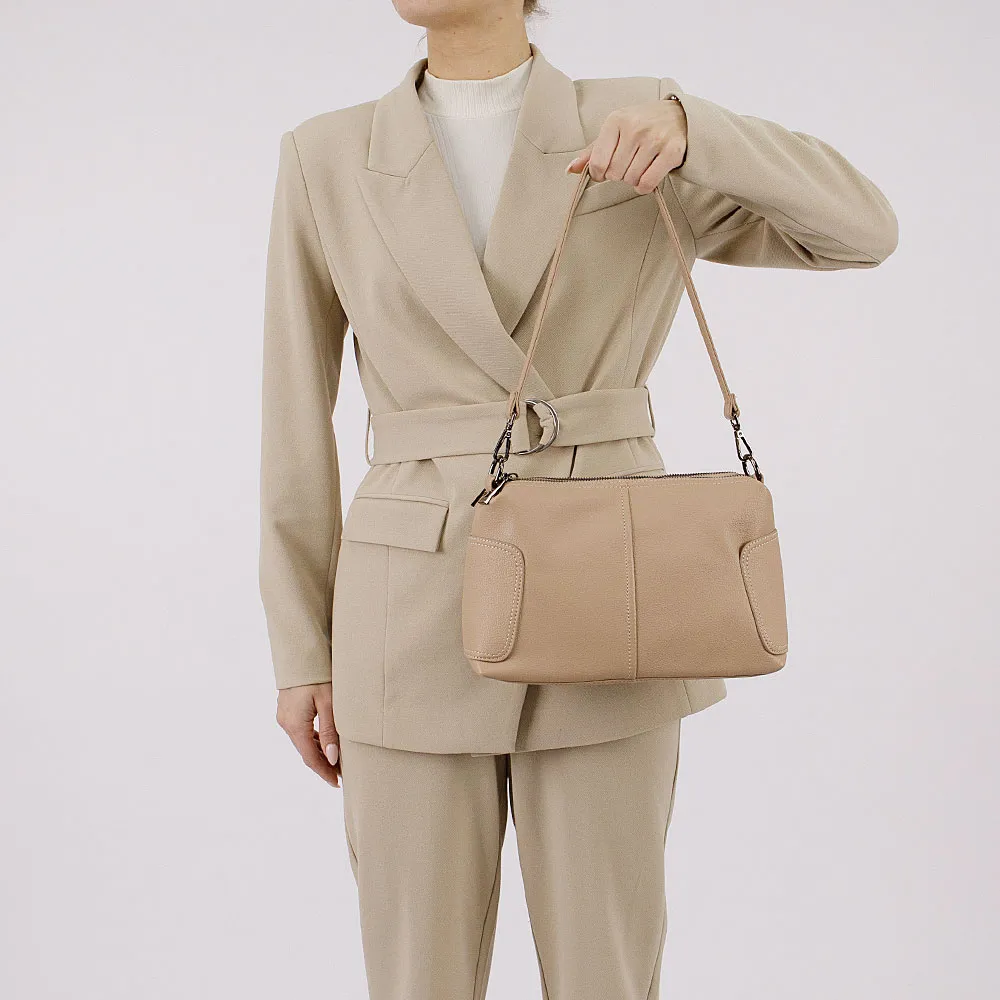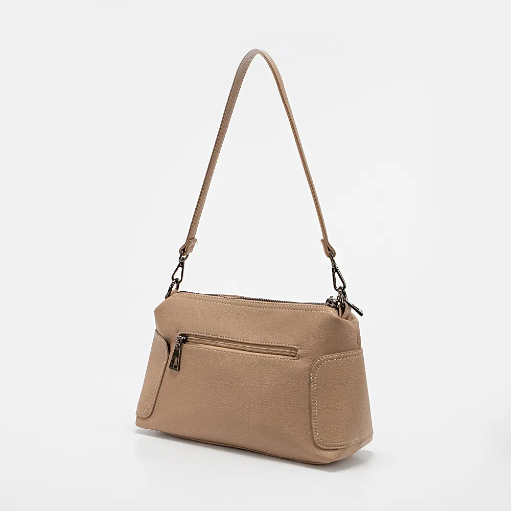 Сумка от торговой марки Passo Avanti из искусственной кожи бежевого цвета. Модель с удлиненной съемной ручкой и съемным регулируемым плечевым ремнем. Два отделения на молнии, с текстильной подкладкой. В заднем отделении – карман на молнии, в переднем – накладной карман.