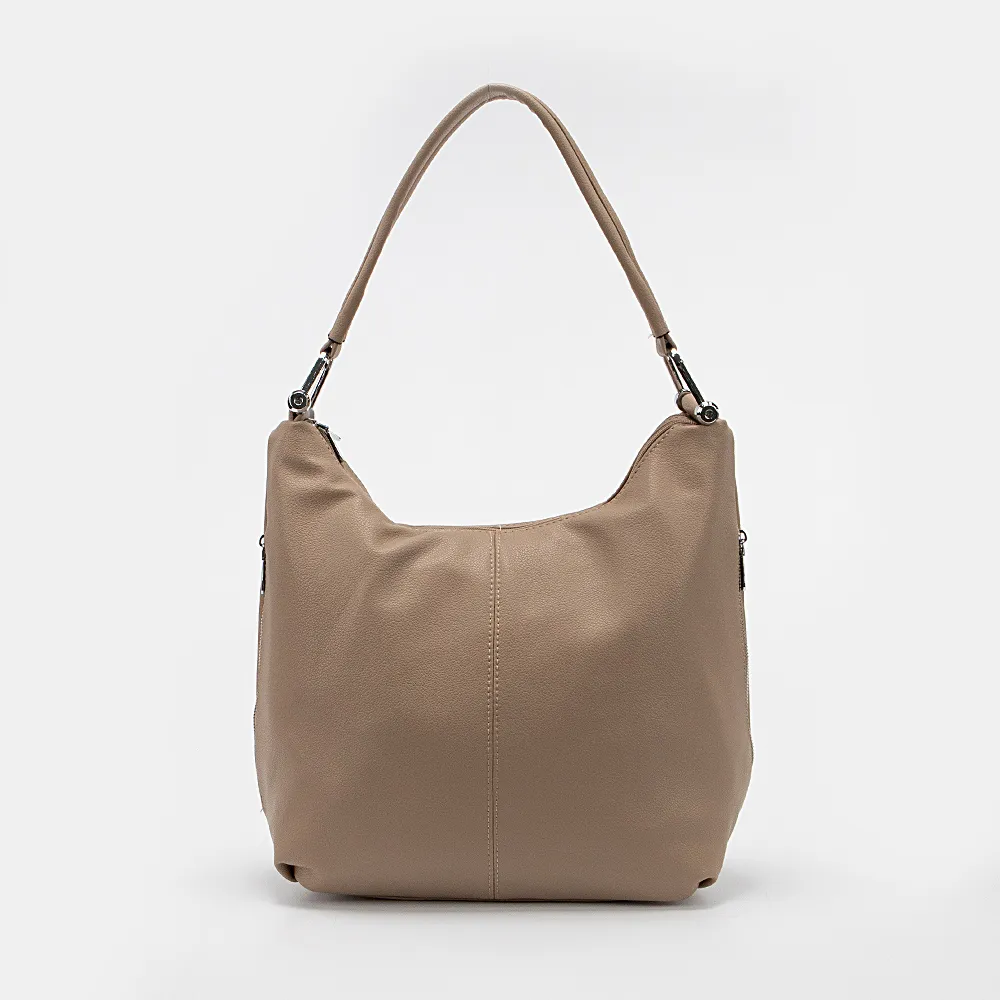 Сумка от торговой марки Passo Avanti из искусственной кожи бежевого цвета. Вместительная модель с одной широкой ручкой на оригинальных кольцах. Два отделения на молнии, с текстильной подкладкой. В заднем отделении – карман на молнии, в переднем – два накладных кармана. По бокам – вертикальный карман на молнии. На задней стороне – карман на молнии.