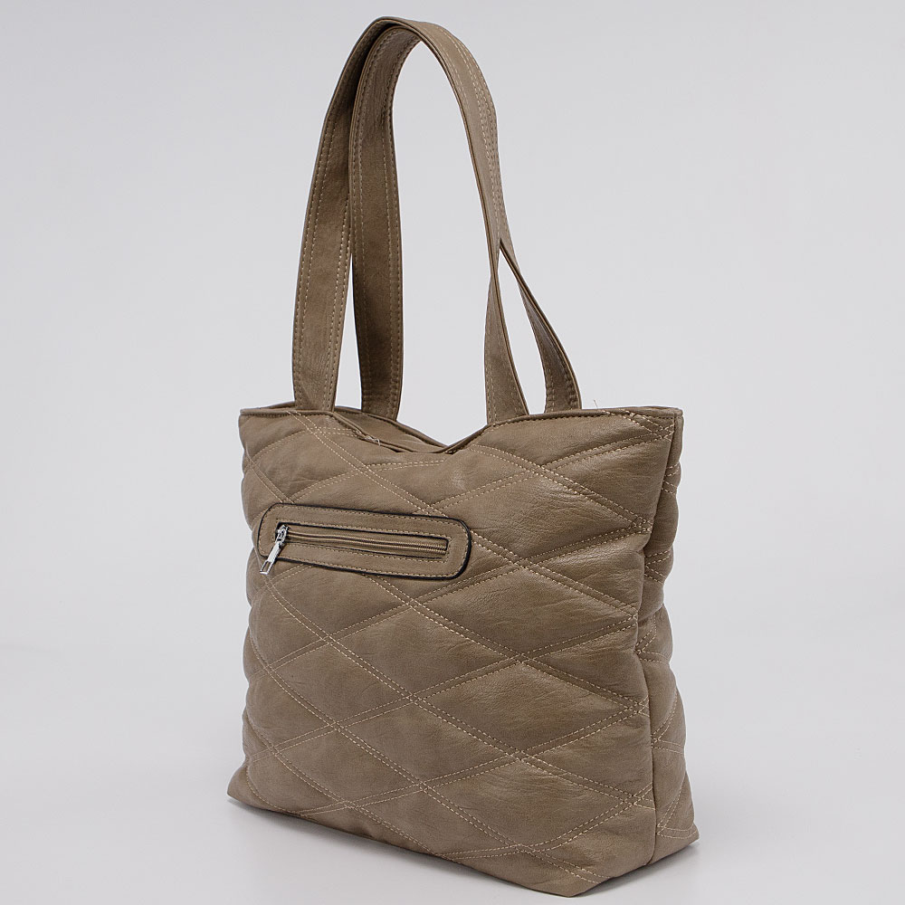 Сумка от торговой марки Passo Avanti из искусственной кожи кофейного цвета с горизонтальной ромбовидной стежкой. Модель с двумя удлиненными ручками. Отделение на молнии. Внутри: текстильная подкладка, средник и карман на молнии, два накладных кармана. На задней стороне - карман на молнии.