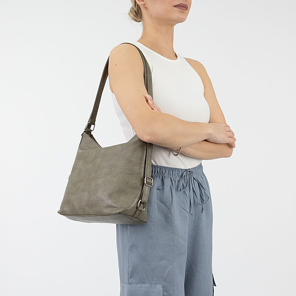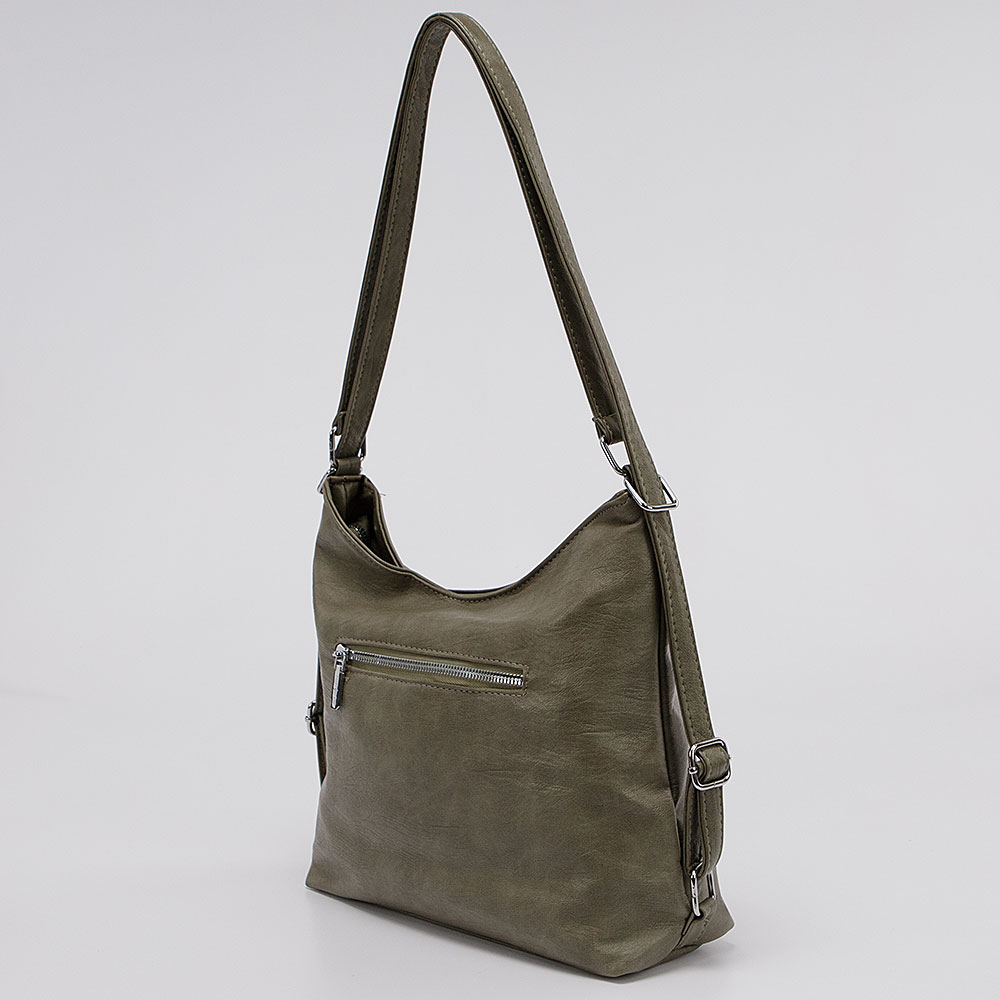 Сумка-рюкзак от торговой марки Passo Avanti из искусственной кожи цвета хаки. Модель среднего размера, с двумя ручками, которые стягиваются в плечевые лямки. Отделение на молнии. Внутри: текстильная подкладка, карман на молнии, два накладных кармана. На задней стороне – карман на молнии.