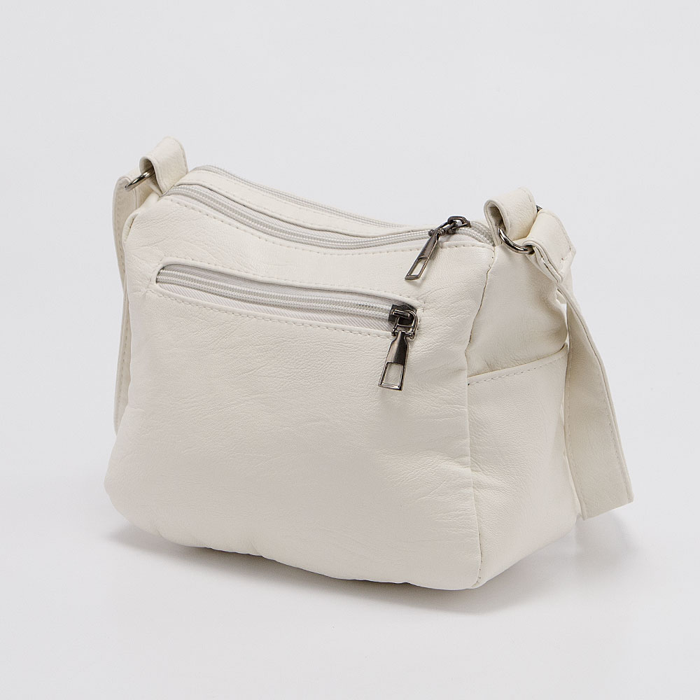 Сумка от торговой марки Passo Avanti из искусственной кожи белого цвета. Компактная миниатюрная модель с несъемным регулируемым плечевым ремнем. Два отделения на молнии, с текстильной подкладкой. В одном из отделений – карман на молнии. На лицевой стороне, декорированной вставками, имеется два кармана на молнии. По бокам – накладной карман без застежки. На задней стороне – карман на молнии.