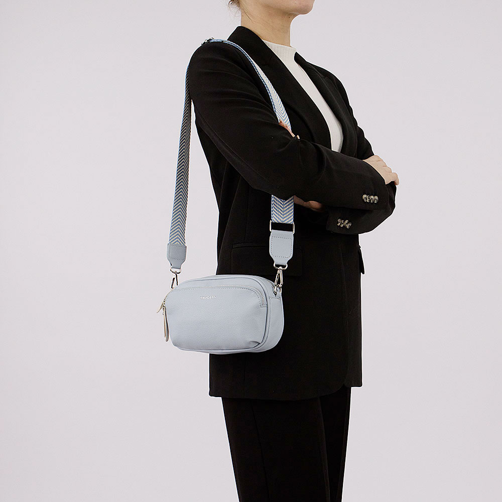 Сумка от торговой марки Valigetti из искусственной кожи голубого цвета. Модель со съемным регулируемым плечевым ремнем, выполненным из текстильного материала с оригинальным рисунком «елочкой». Отделение на молнии. На лицевой стороне – карман на молнии. На задней стороне – накладной карман для карт.