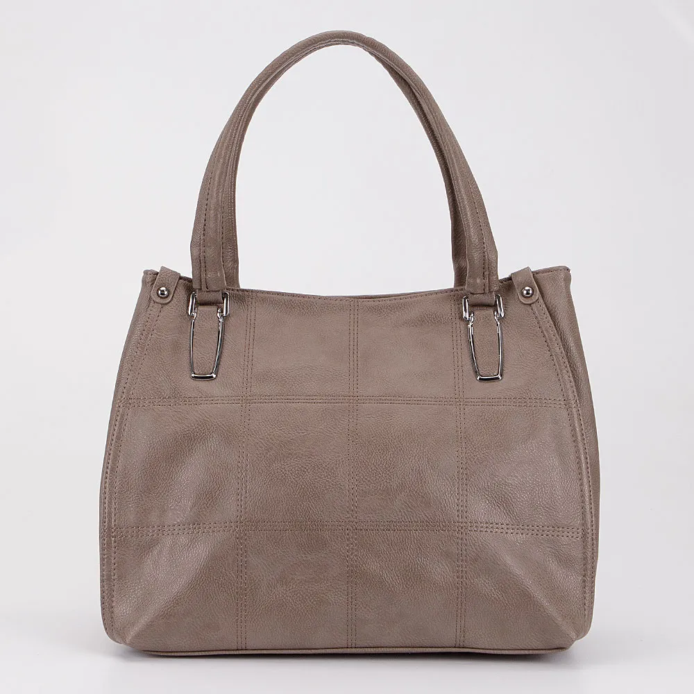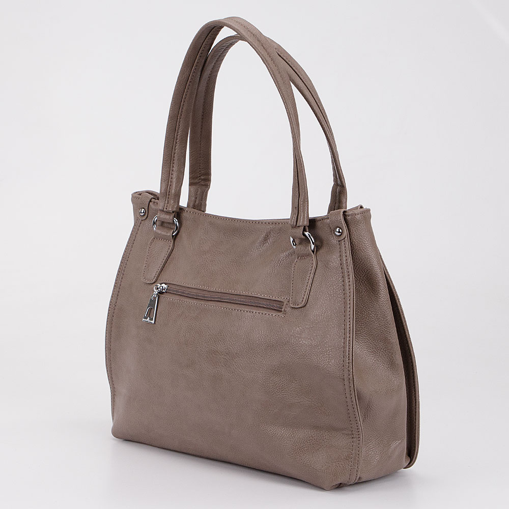 Сумка от торговой марки Passo Avanti выполнена из искусственной кожи кофейного цвета. Вместительная модель с двумя удлиненными ручками. Отделение на молнии. Внутри: текстильная подкладка, средник и карман на молнии, два накладных кармана. На задней стороне – карман на молнии. Передняя сторона декорирована отстрочкой.