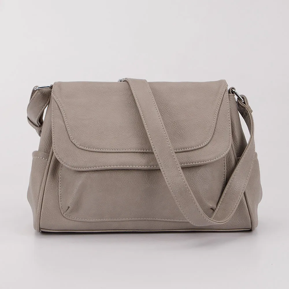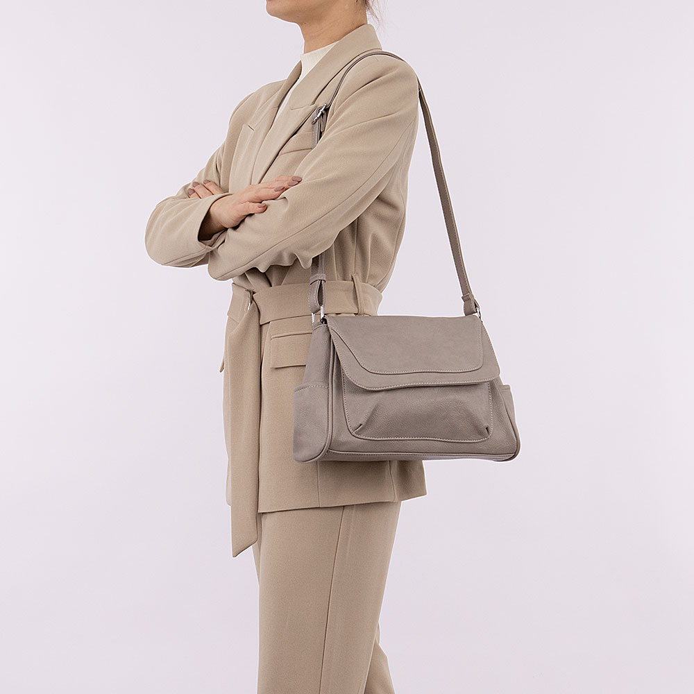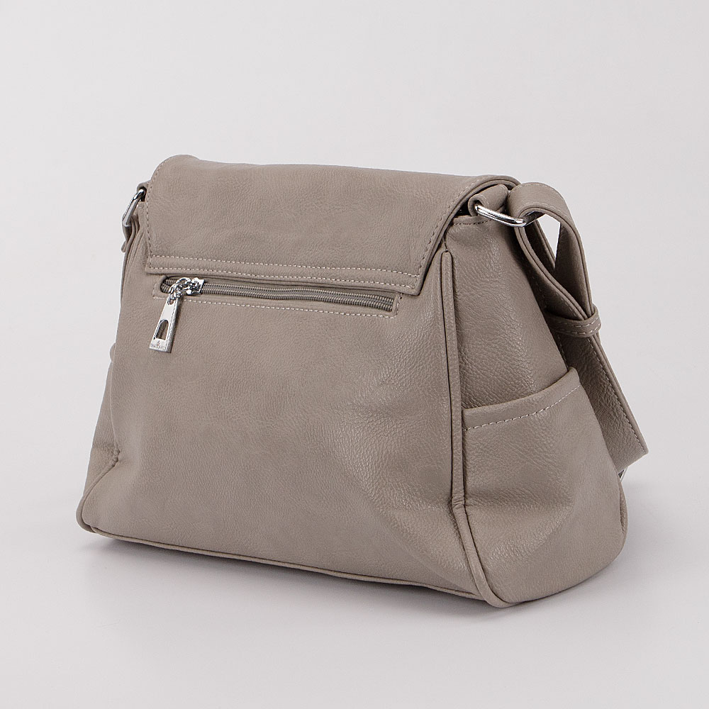 Сумка от торговой марки Passo Avanti выполнена из искусственной кожи серого цвета. Модель с несъемным регулируемым плечевым ремнем. Клапан на магнитной кнопке закрывает карман на молнии и отделение на молнии. В отделении: текстильная подкладка, средник и карман на молнии, два накладных кармана. На задней стороне – карман на молнии.