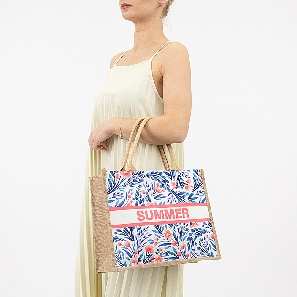 Пляжная сумка от торговой марки Mr.Bag из текстильного материала мешковины. Декорирован оригинальным ярким цветочным принтом и надписью «Summer». Модель квадратной формы с двумя удлиненными ручками. Отделение на молнии. Внутри: без подкладки.