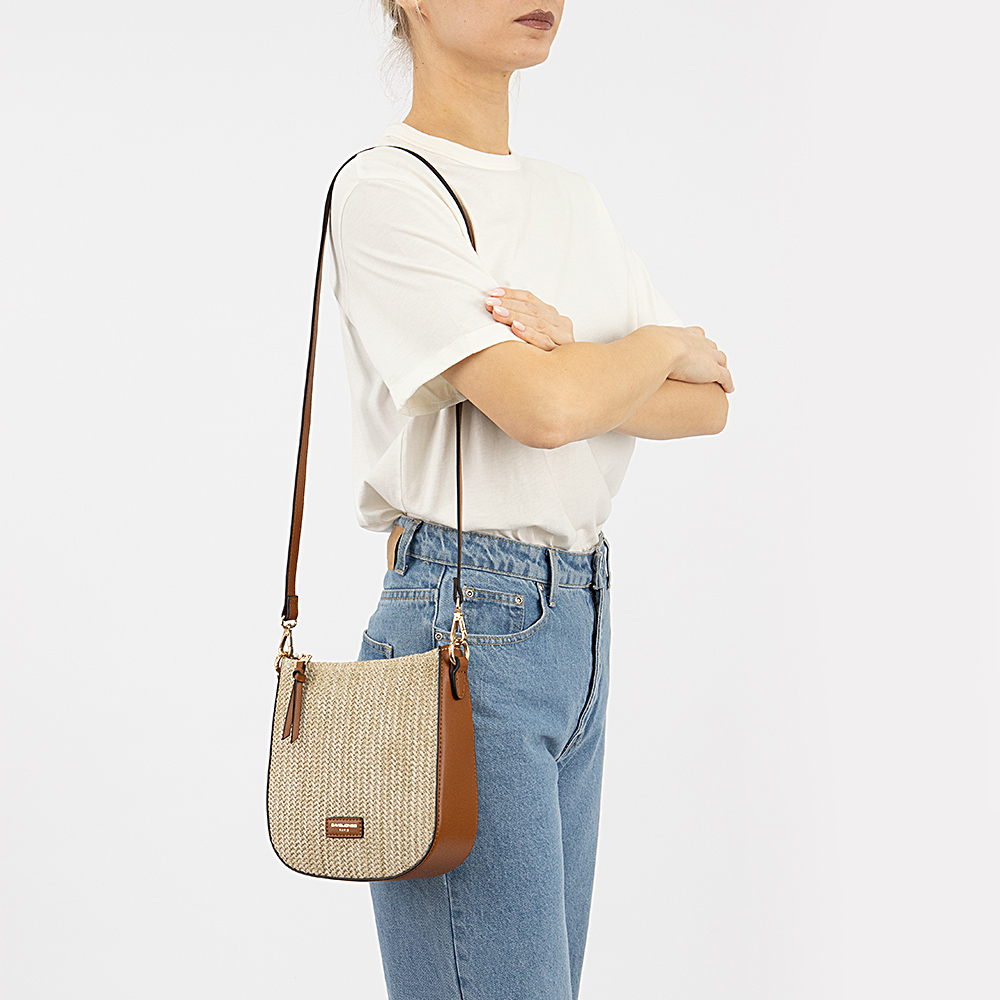 Сумка от торговой марки David Jones из текстиля с оригинальным плетением и искусственной кожи коньячного цвета. Модель со съемным регулируемым плечевым ремнем. Отделение на молнии. Внутри: яркая фирменная подкладка, карман на молнии, накладной карман. На задней стороне – карман на молнии.