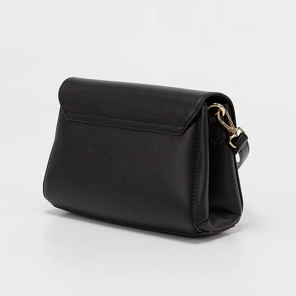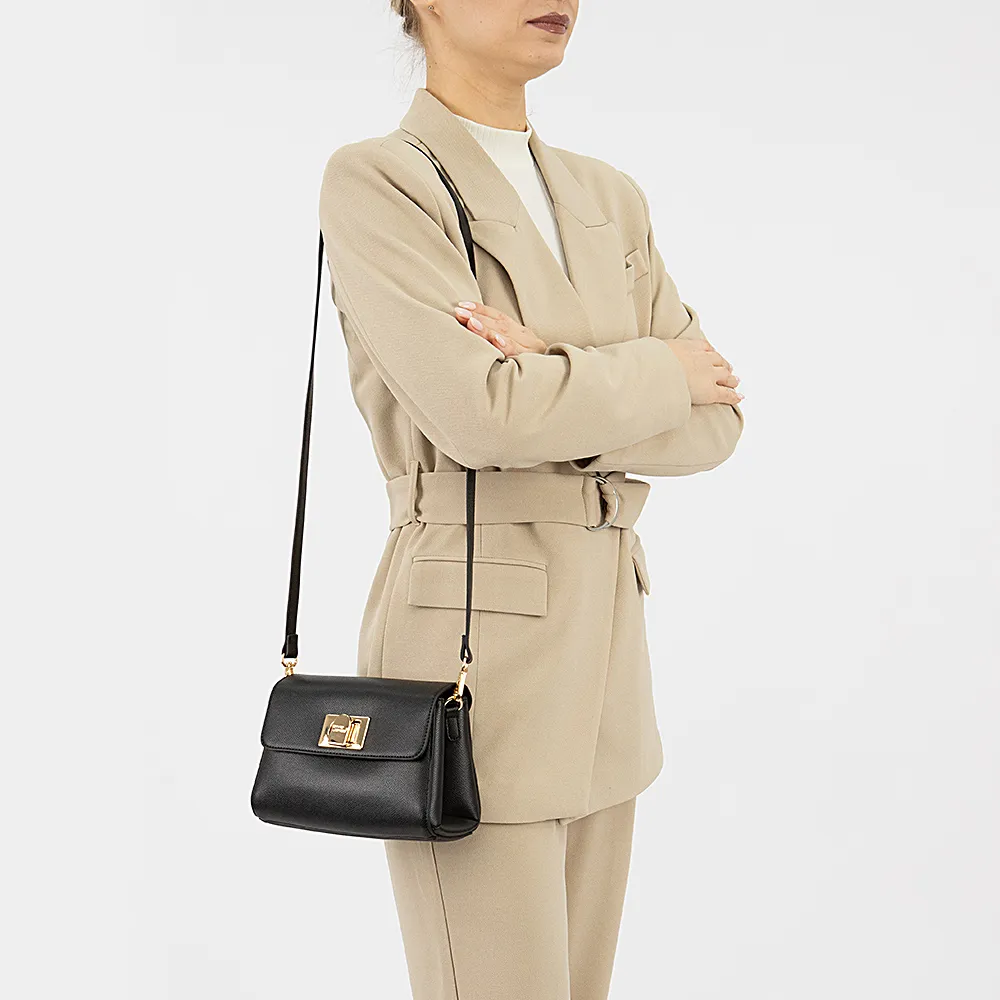Сумка от торговой марки David Jones из искусственной кожи черного цвета. Модель со съемным регулируемым плечевым ремнем. Закрывается клапаном на поворотном замке. Два отделения с фирменной подкладкой. Переднее закрывается хлястиком на магнитной кнопке; внутри: два накладных кармана. Заднее отделение на молнии; внутри: карман на молнии. На задней стороне – карман на молнии.