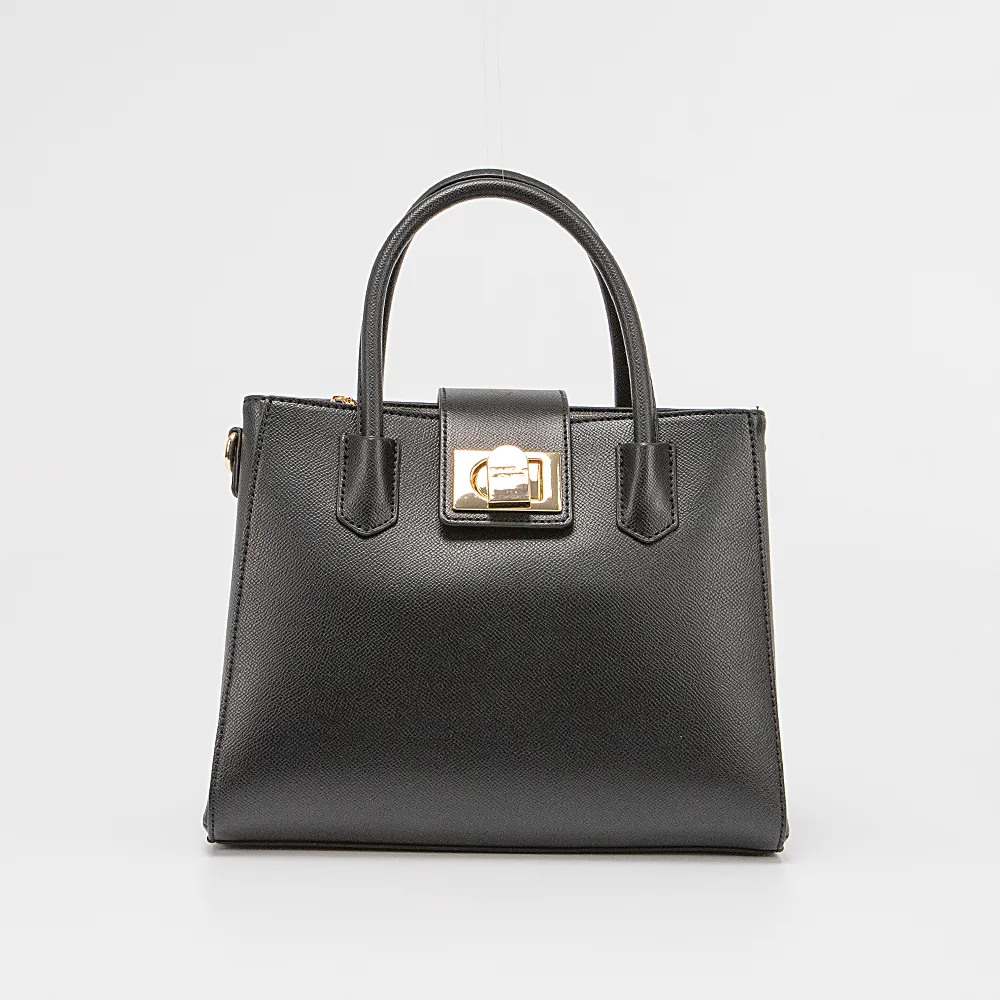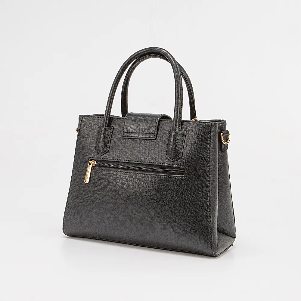 Сумка от торговой марки David Jones из искусственной кожи черного цвета. Модель с двумя ручками и съемным регулируемым плечевым ремнем. Закрывается коротким узким клапаном на поворотном замке и молнией. Внутри: два отсека с фирменной подкладкой; в переднем – накладной карман, в заднем – карман на молнии. На задней стороне – карман на молнии.