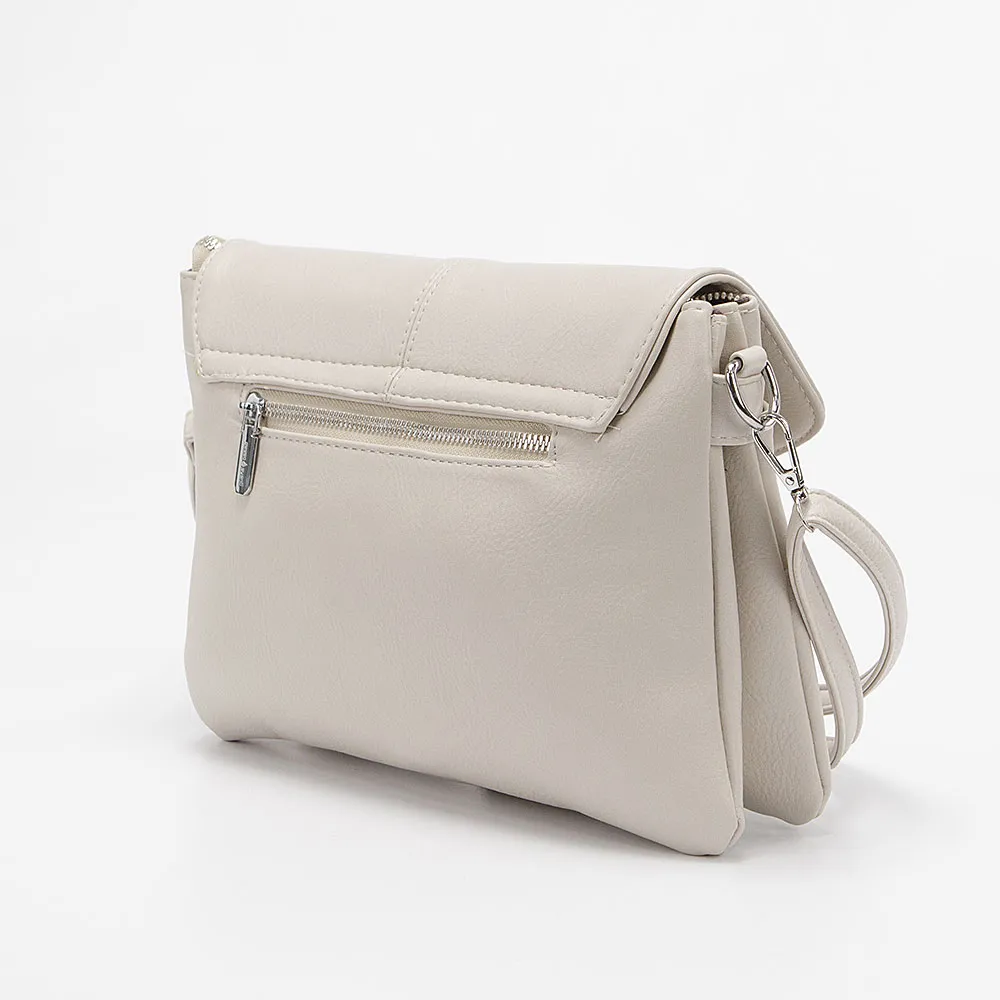Сумка от торговой марки Passo Avanti из искусственной кожи светло-серого цвета. Вместительная модель-конверт со съемным регулируемым плечевым ремнем. Клапан на магнитной кнопке закрывает накладной карман на магнитной кнопке и отделение на молнии. Внутри: текстильная подкладка, три отсека с текстильной подкладкой. В заднем отсеке – карман на молнии, в переднем – два накладных кармана.